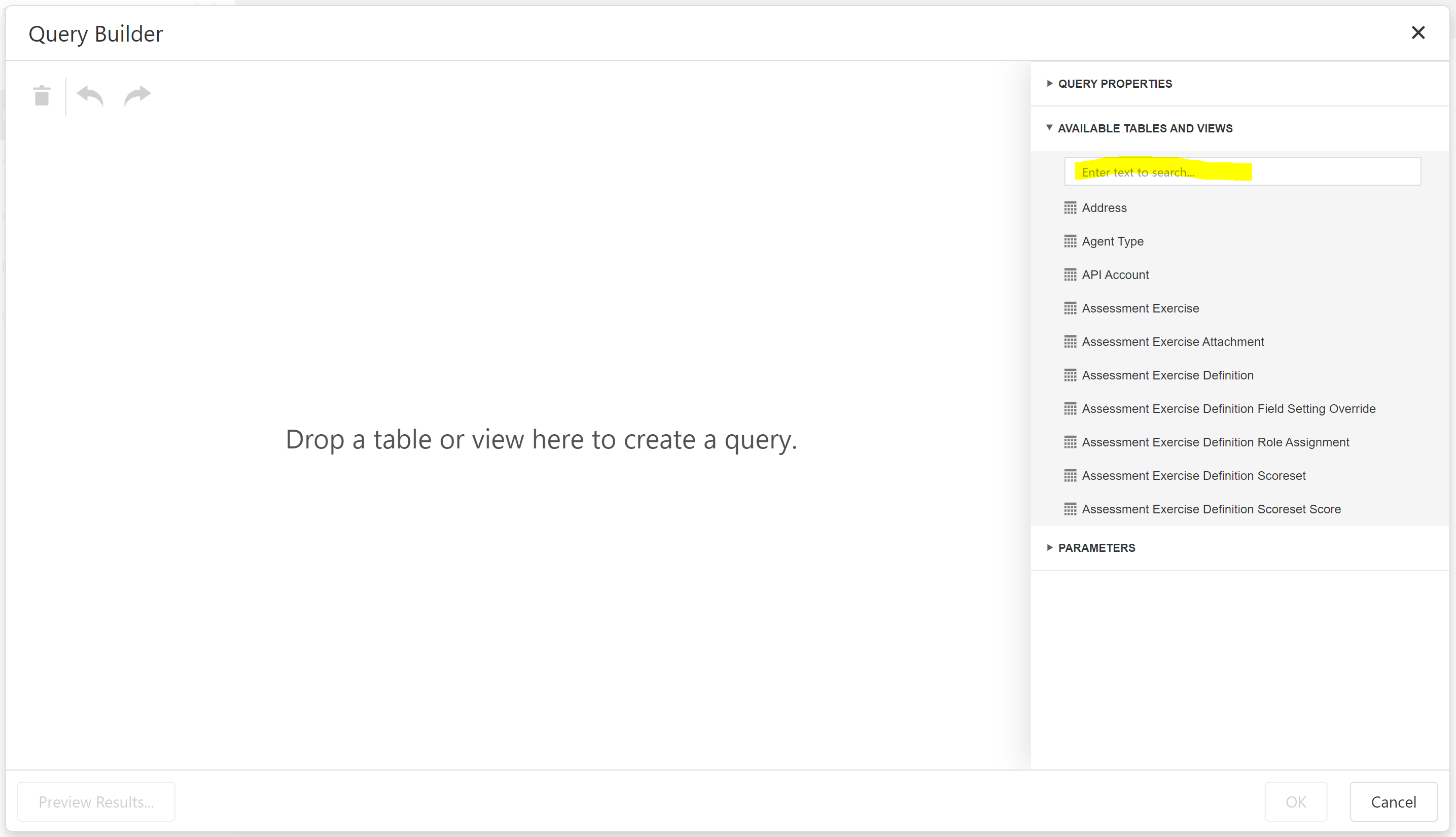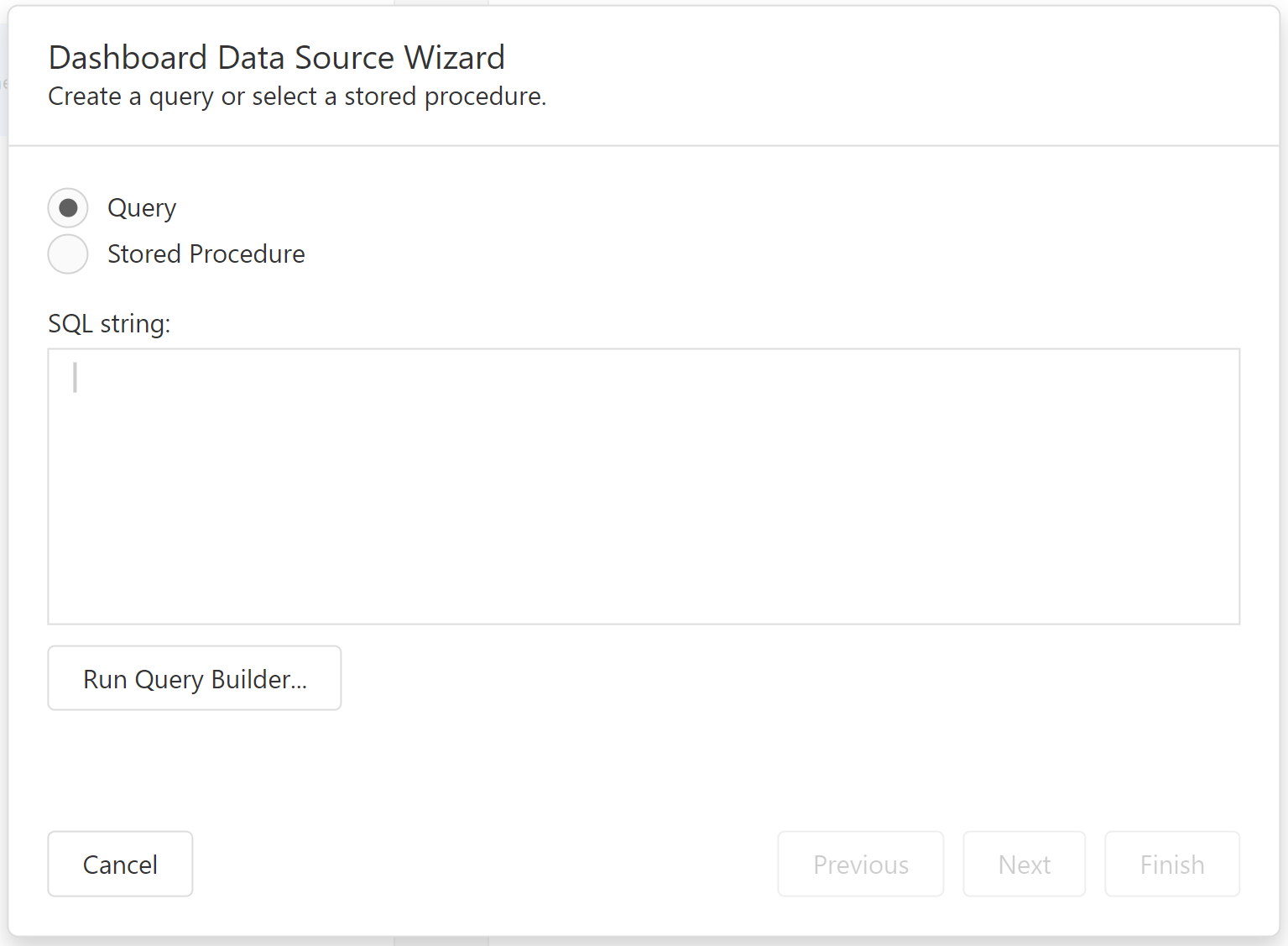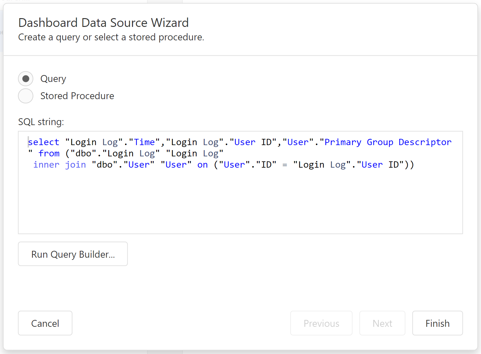 We are going to use the query builder, a friendly drag-and-drop-based way to select data from the Reporting Database. You can choose instead to write your own SQL string if you are familiar enough with the SQL language. Elements uses the T-SQL variant of the SQL language (which fully supports SQL within it). Or you can choose to invoke a custom stored procedure that you might previously have added to the Reporting Database.Click the "Run Query Builder..." button.