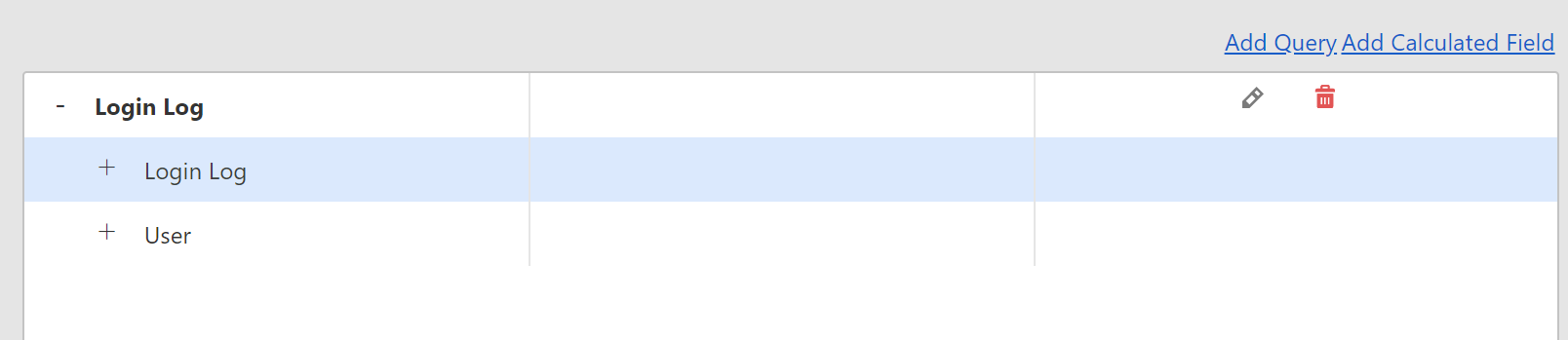 Next, Look for the User table and add that to the design surface, too. Select its Primary Group Descriptor column. Finally, drag the User ID column of the Login Log table to the ID column if the User table. This tells the Query Designer how the data rows in the two tables are related: for every row in the Login Log table, the relevant row in the User table is the row whose ID matches the User ID column of the Login Log. Your query designer surface should now something look like this: