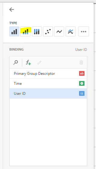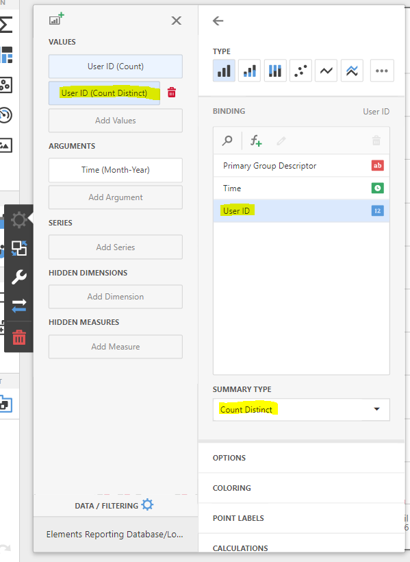 Reopen the binding configuration area by clicking on the cog symbol that appears to the left of the chart area when hovering over the chart. Click on the Add Values button, again selecting the User ID column of the bound query. From the Summary Type drop-down, choose the Count Distinct measure.