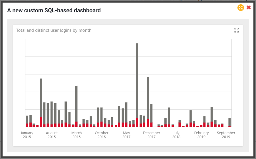 This dashboard is now measuring the number of login events by users of the system in each month of history of usage. A useful visualisation for tracking system engagement!