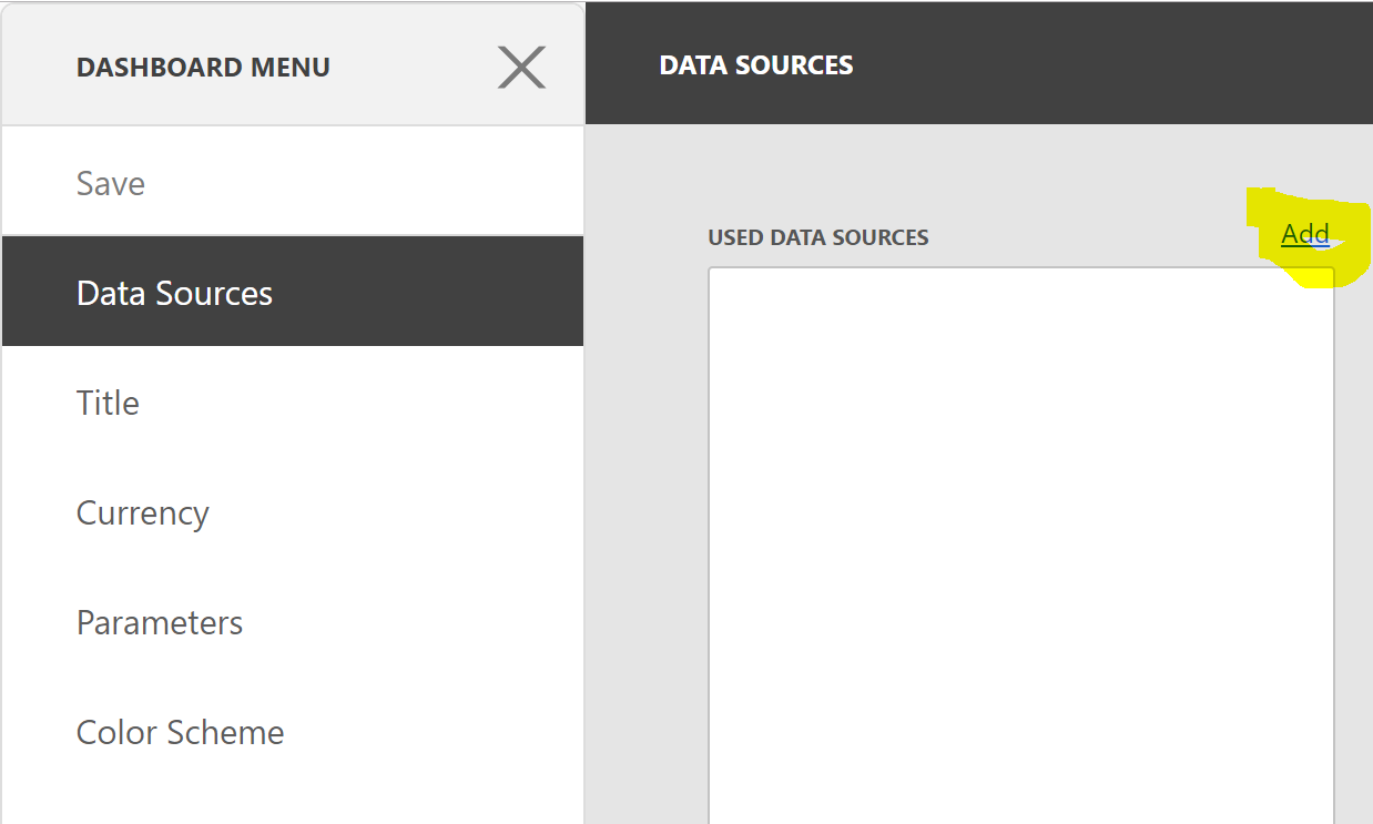 We are going to configure the dashboard to select some interesting data from the Elements Reporting Database. We will later bind this data to items on the dashboard in order to visualise it. Click on the menu button and select Data Sources. From there select the Add hyperlink to add a data source to the dashboard.