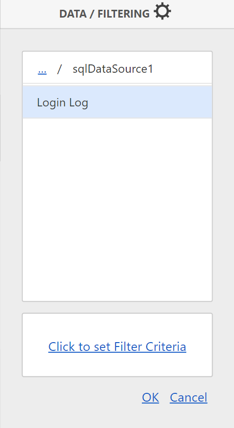 Click on the Data / Filtering link at the bottom of the binding configuration area. This will open up and provide information showing us that the chart is bound to the query we authored earlier.