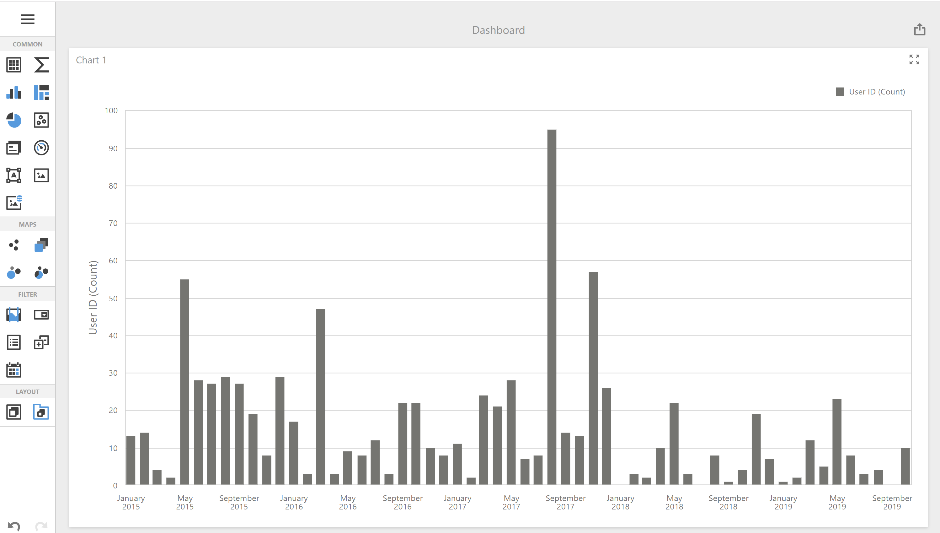 After clicking the Add Value box, select the User ID column and then ensure the Count option is selected under the Summary Type section. This ensures the bar chart's bars will count rows in the results set (more accurately it will count the number of rows with a non-null value for User ID). The default option of Sum would instead cause the bar chart's bar heights to represent the sum the IDs of users, which would not make sense for our purposes. This ability to subtly vary what is "measured" in a dashboard is both interesting and important when designing your own dashboards.