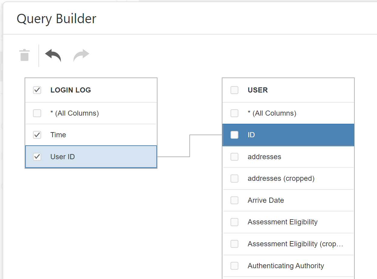 Enter the text "Login Log" into the table search text box, then double-click on the Login Log table in the result section below it, or drag that table to the design surface of the query builder. Check the Time and User ID columns in the table that is displayed.