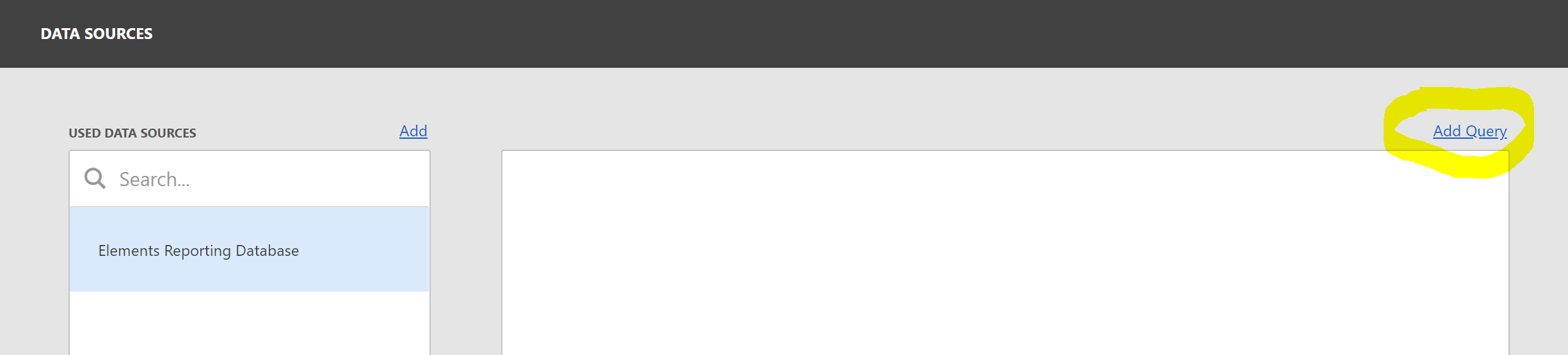 Once you have added the Elements Reporting Database as the data source for your dashboard, you need to click on Add Query in order to select data from the database.