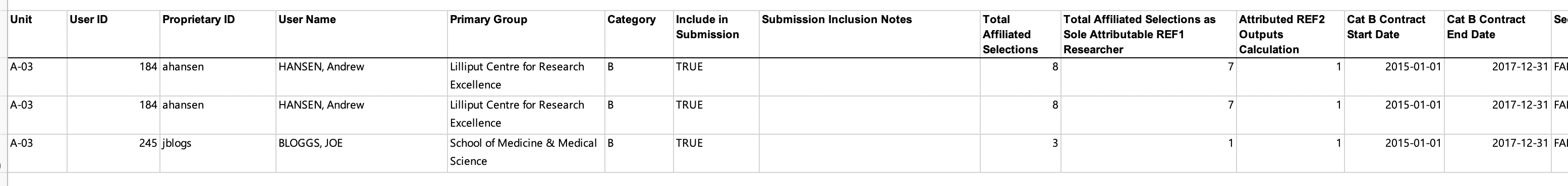 Note that in the Cat B tab, where multiple contracts are being returned for a Cat B Researcher, there will be one row per contract (so some data (e.g. Date of Birth, Name) will be duplicated
