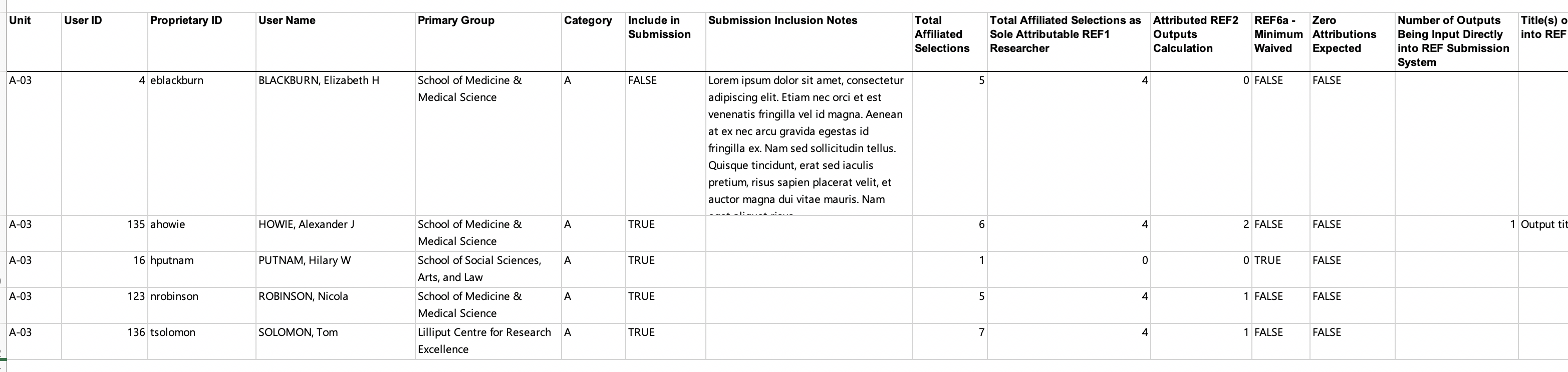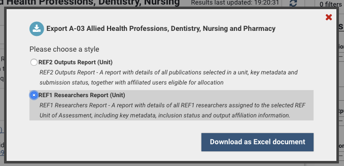 The REF1 Researchers Report is designed to give managers of a unit or an exercise definition ready access in Microsoft Excel to a detailed list of all REF1 Researchers in the REF submission.