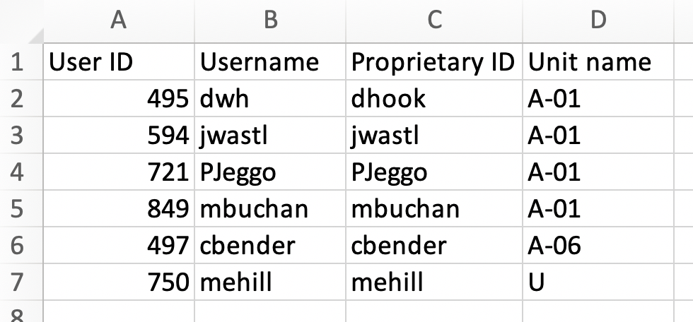 To change an individual's unit allocation, just overwrite the existing Unit name with the desired unit (using the accepted coding (e.g. B-12, D-32, A-03B)). Save the file, then upload and submit.