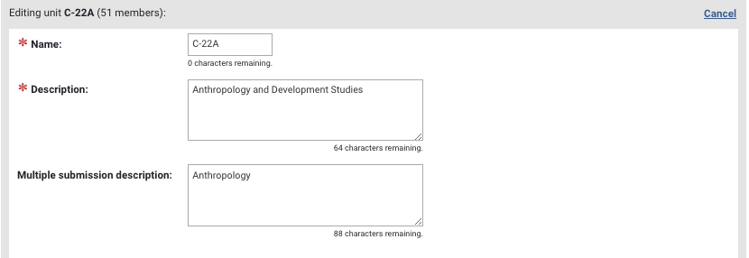 Further, you should ensure that the Unit 'Description' should be the full Unit name, and the 'Multiple submission description' the name of the multiple submission