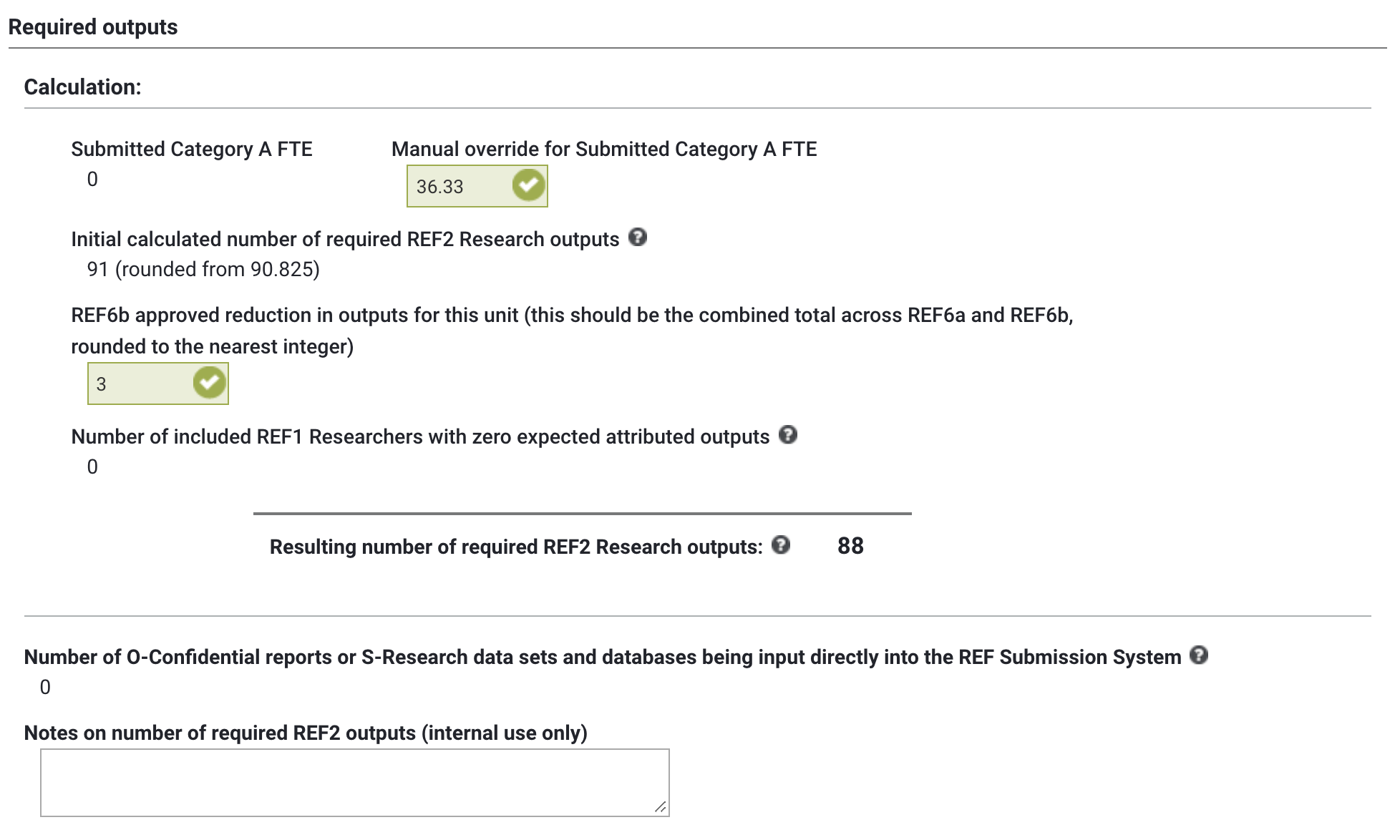 Number of included REF1 Researchers with zero expected attributed outputs | In order to accurately calculate the number of attributed REF2s required for the unit (which includes reducing the overall number required by one for each Cat A submitted with zero attributions and no REF6a waiver), this field sums up those REF1 Researchers where it is expected they will have zero attributions and no REF6a waiver. Sourced from included REF1 Researchers. See the REF1 Researchers form support article for further details. |