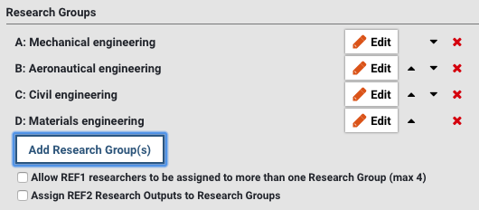 Adding Research groups enables you to assign your REF1 Researchers and (optionally) their REF2 Research outputs to Research groups.