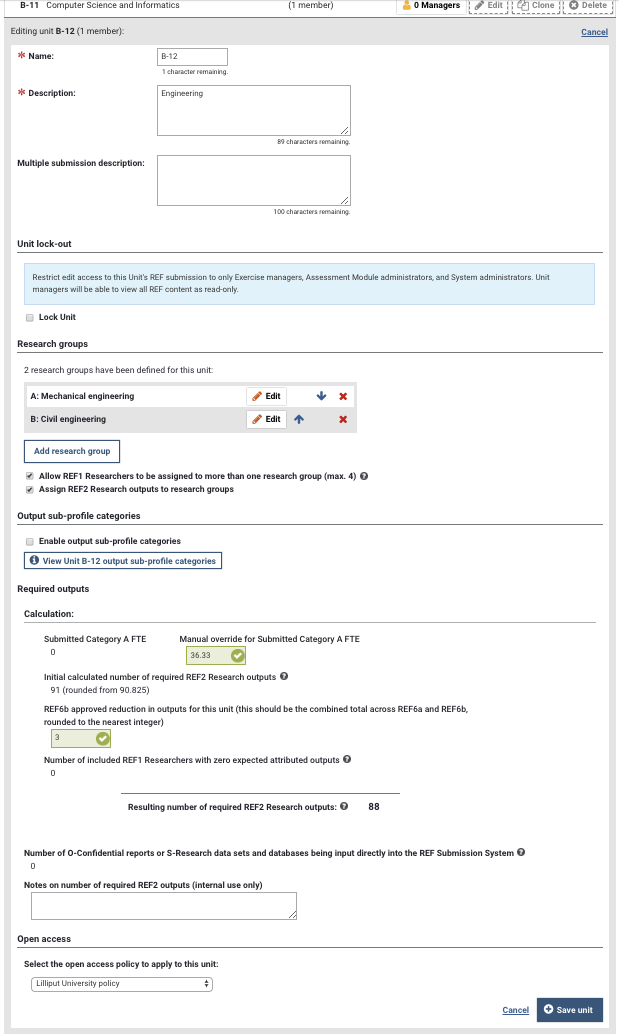 You can select the Open Access policy to apply to the UoA. The main purpose of this option is to support different embargo period maxima in Panels A/B and C/D. Further information on the implications of OA policy selection is available in the REF2: Open Access tab support article.