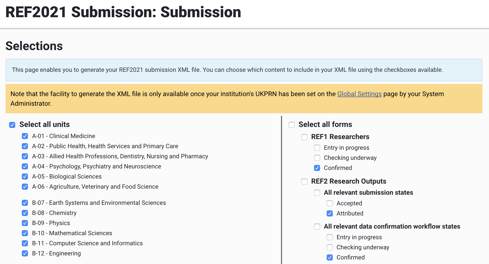 In order to generate your submission XML file, your System Administrator must first set your institution's UKPRN at the bottom of the Global Settings page (System Admin > Setup > Global settings).