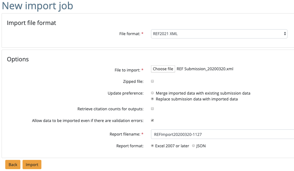 When importing the XML file generated to the REF submission system, the following settings are recommended:
