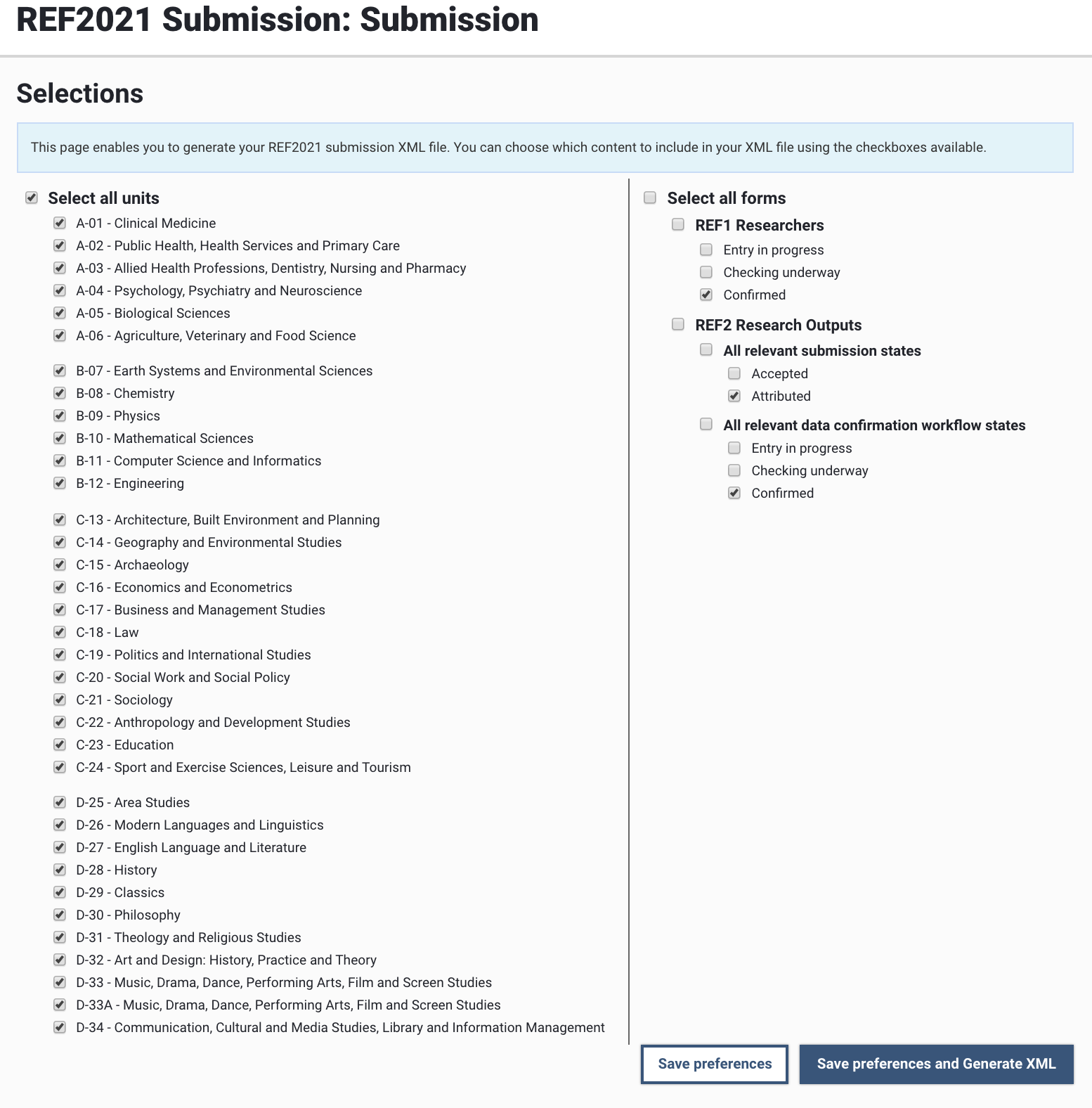 Accessible from the Manage Units screen, the Submission screen enables System Administrators and Exercise Managers to generate and download the REF2021 Submission XML file, for manual upload to the REF Submission System.