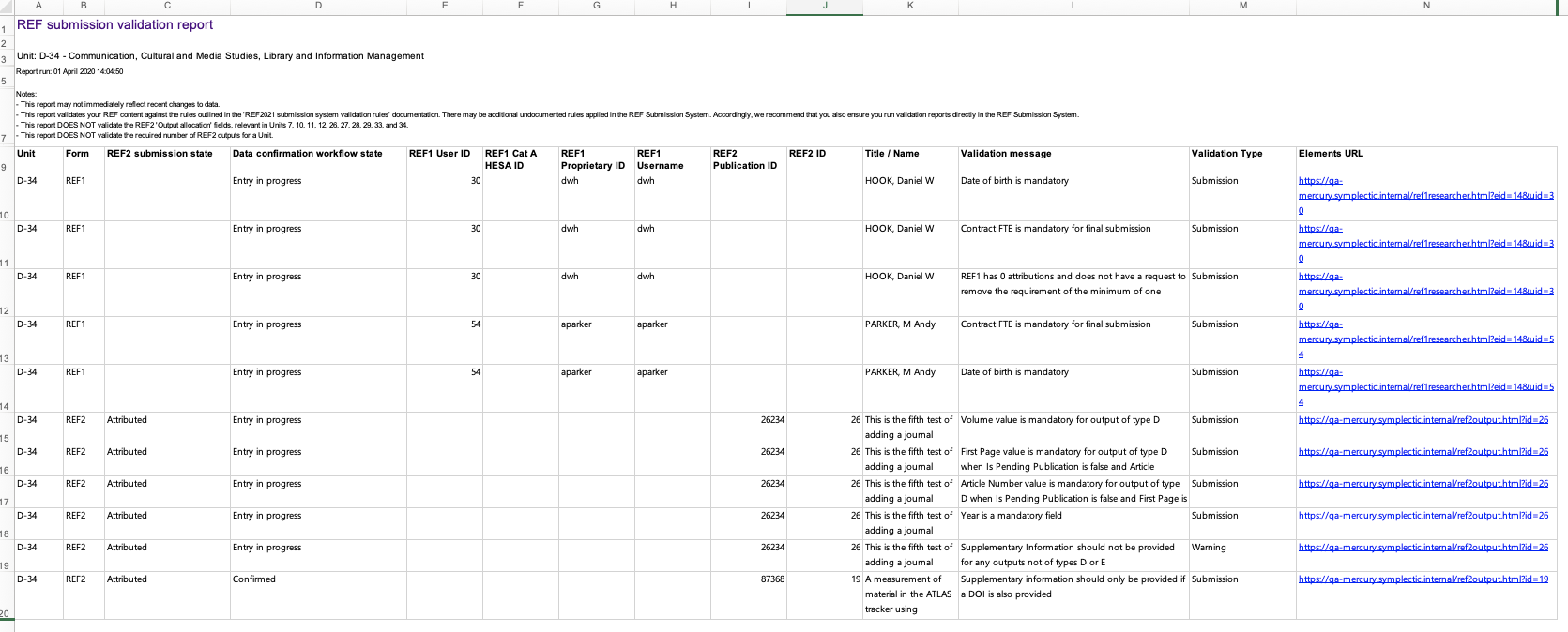 Elements URL | The URL of the record in question, enabling you to go straight to the record to resolve the validation issue. For 'REF2 staff output link' messages, the URL is for the REF2 record. |