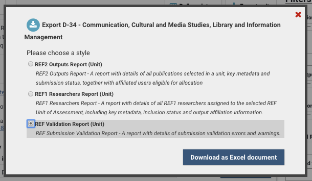 Note that the REF Submission Validation report validates your REF content against the rules outlined in the REF2021 submission system validation rules. There may be additional undocumented rules applied in the REF Submission System. Accordingly, we recommend that you also ensure you run validation reports directly in the REF Submission System.