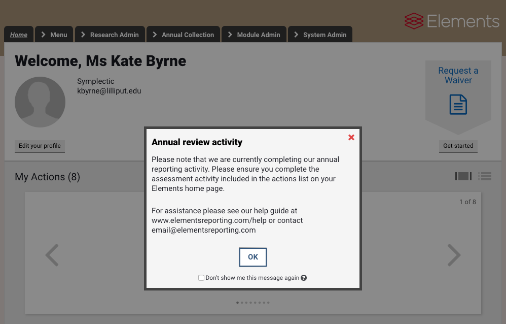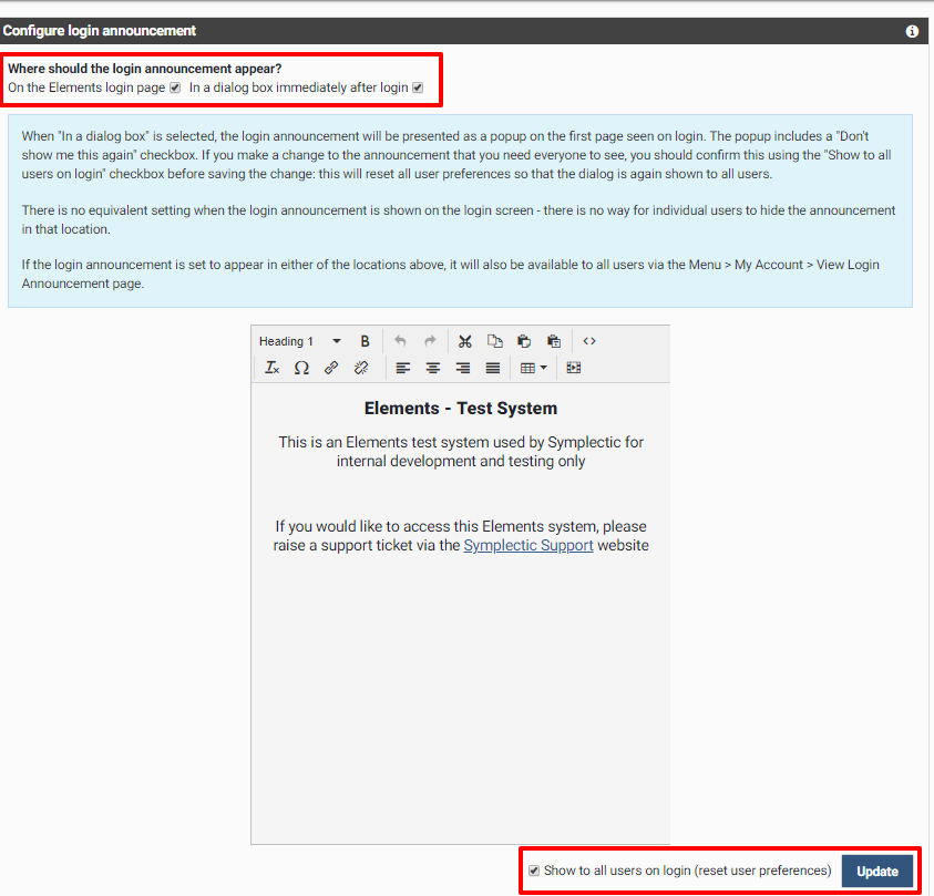 This article relates to the page found under System admin > Notifications & actions > Edit login announcement in the navigation menu. It describes how to display custom announcements to their users when they log into Elements to highlight key deadlines, new features or system downtime. Institutions can now display custom login announcements, not only on the Elements login screen but also as a pop-up when a user logs in to ensure that institutions can share announcements with their users even if they use Shibboleth or another authentication system that skips the Elements login page.