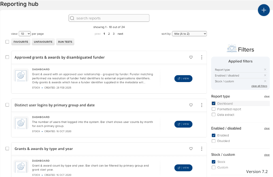 Maintenance of custom reports through future Elements upgrades | You might develop your custom reports yourselves, commission Symplectic or a third party to develop them for you, or perhaps otherwise obtain copies of useful custom report definitions from the Elements community. These are all encouraged and are all great ways to make the best use of your Elements system. Regardless of the origin of a custom report, even if it was obtained by cloning a stock report from a current or older version of Elements, a custom report is not a part of the Elements product provided by Symplectic and is always owned by your institution. It remains your institution's responsibility to test it and maintain it in working order as you make changes to Elements itself, including upgrading Elements to newer versions. There is helpful functionality for managers of the Reporting Hub for testing that reports whose primary role is to generate a file (formatted reports and data extracts), in particular, can still be rendered after an upgrade. Filter to and then select all relevant reports and click the Run Tests bulk action button. This will cause Elements to run the selected reports using some automatically-chosen parameter values. Any errors running the tests will be shown against the relevant reports as the tests complete.