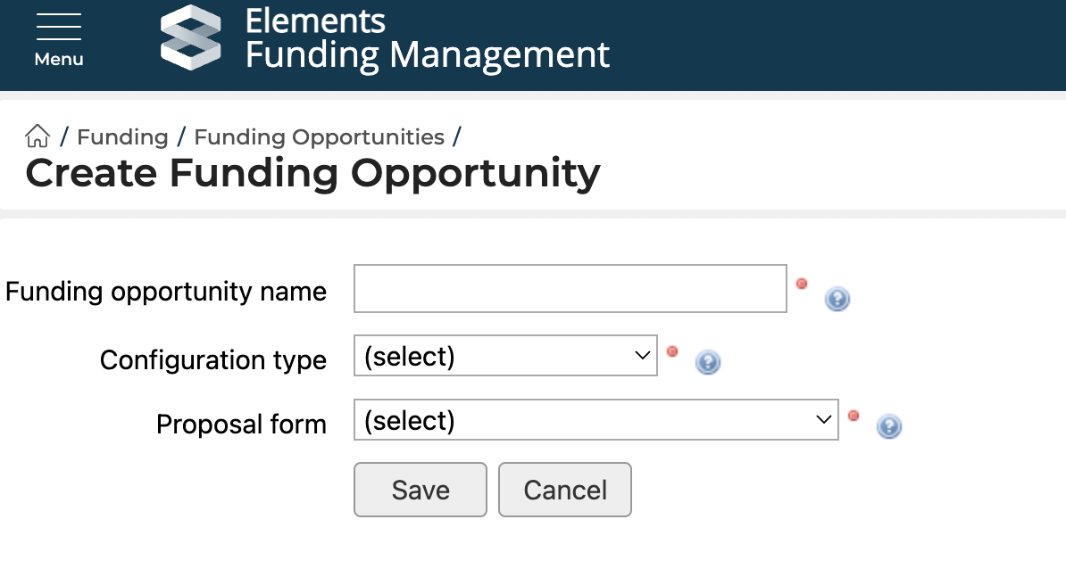 Go to the Funding Management Console and navigate to Funding Opportunities. Select 'New'.