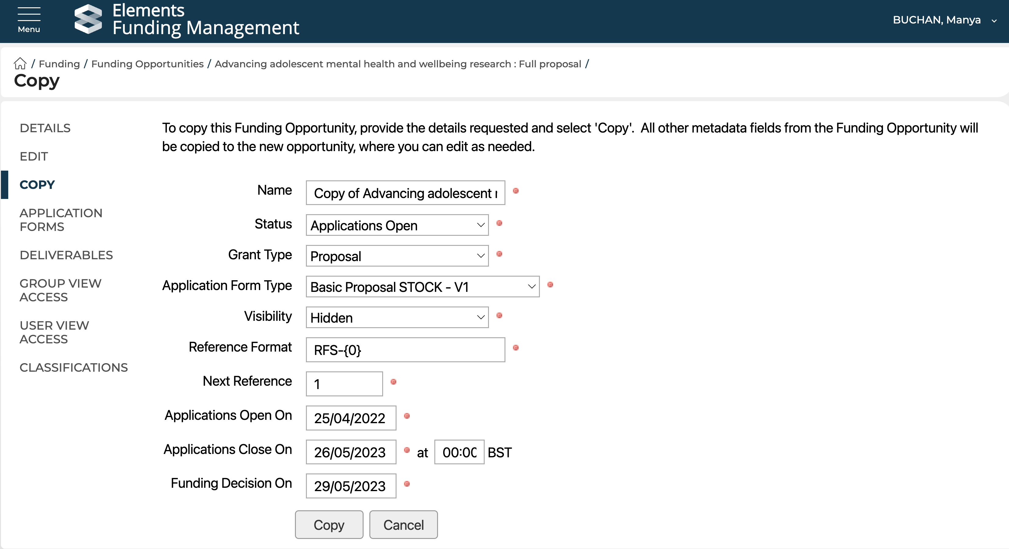 To copy an existing funding opportunity, go to the opportunity you wish to copy, then select 'Copy' from the left-hand menu.