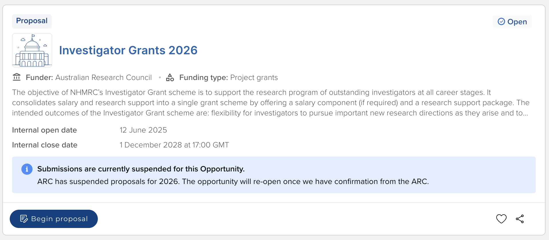 Funder scheme | A funder may offer multiple funding opportunities with different research priorities within the one funding scheme. Listing the wider funding scheme allows for individual funding opportunities to be grouped together. | |