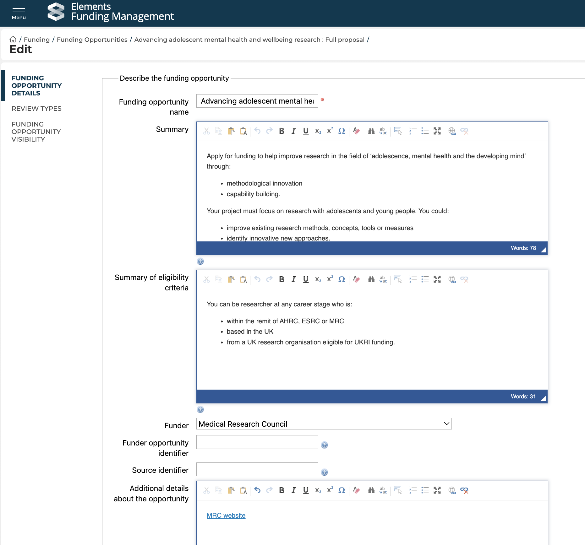 Additional details about the opportunity | Field to support providing additional details about the opportunity such as links back to the original source of the funding opportunity (e.g. Funder's website) | |