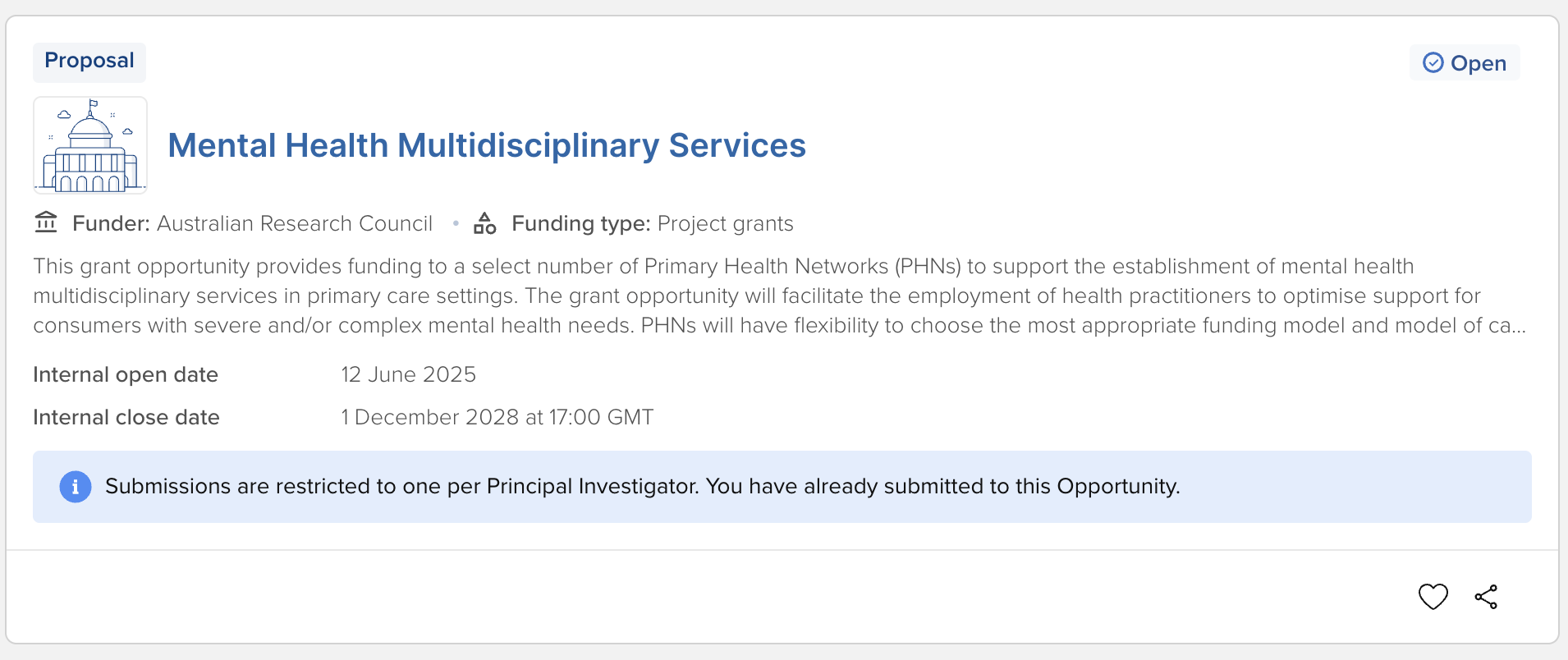 Prevent multiple proposals being submitted | Select to block users from submitting multiple Proposals for this opportunity | |