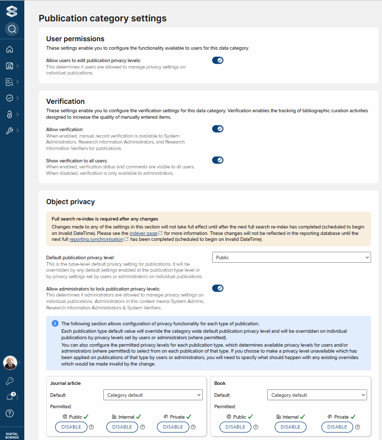 Allow administrators to lock [object] privacy levels - When checked, administrators (System Admins, Research Information Administrators & System Verifiers) are able to lock individual objects of this category to prevent changes.