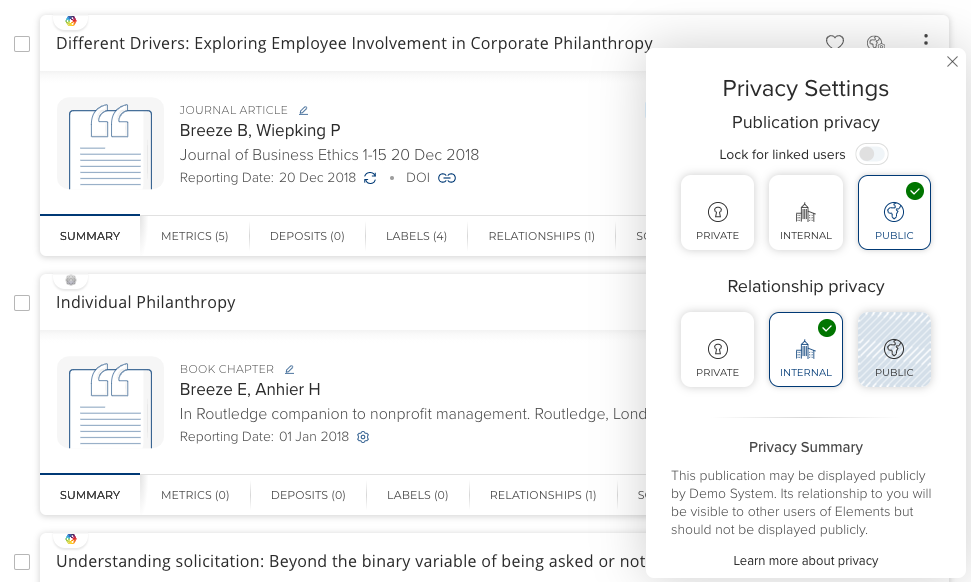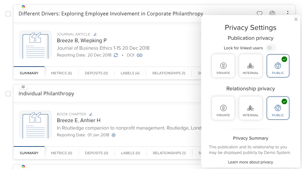 Relationship privacy allows users to manage the visibility of their relationships with an object. Marking a relationship as private does not affect the visibility of an object in the system. Objects with relationships marked as private may still be sent to external systems but the relationship with the user should not be displayed (e.g. a publication might still be sent to a co-authors public profile)