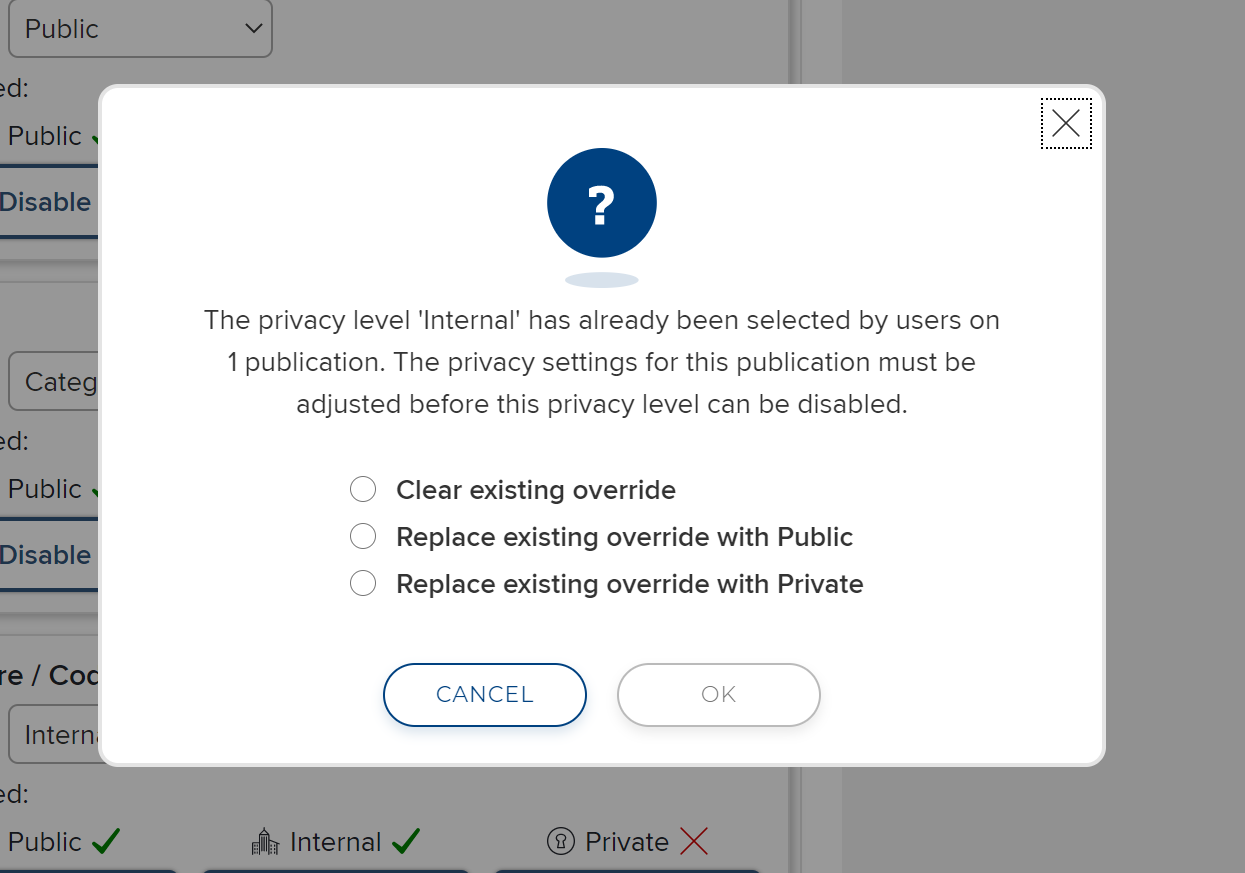 Care must be taken if changing the configuration of privacy settings after they have been used by your community. If an administrator decides to change the range of permitted privacy levels for a particular object-type and wish to disable a privacy level which has already been selected by users they will see a prompt to decide what should happen to existing settings where that privacy level was selected by users. You can choose to: