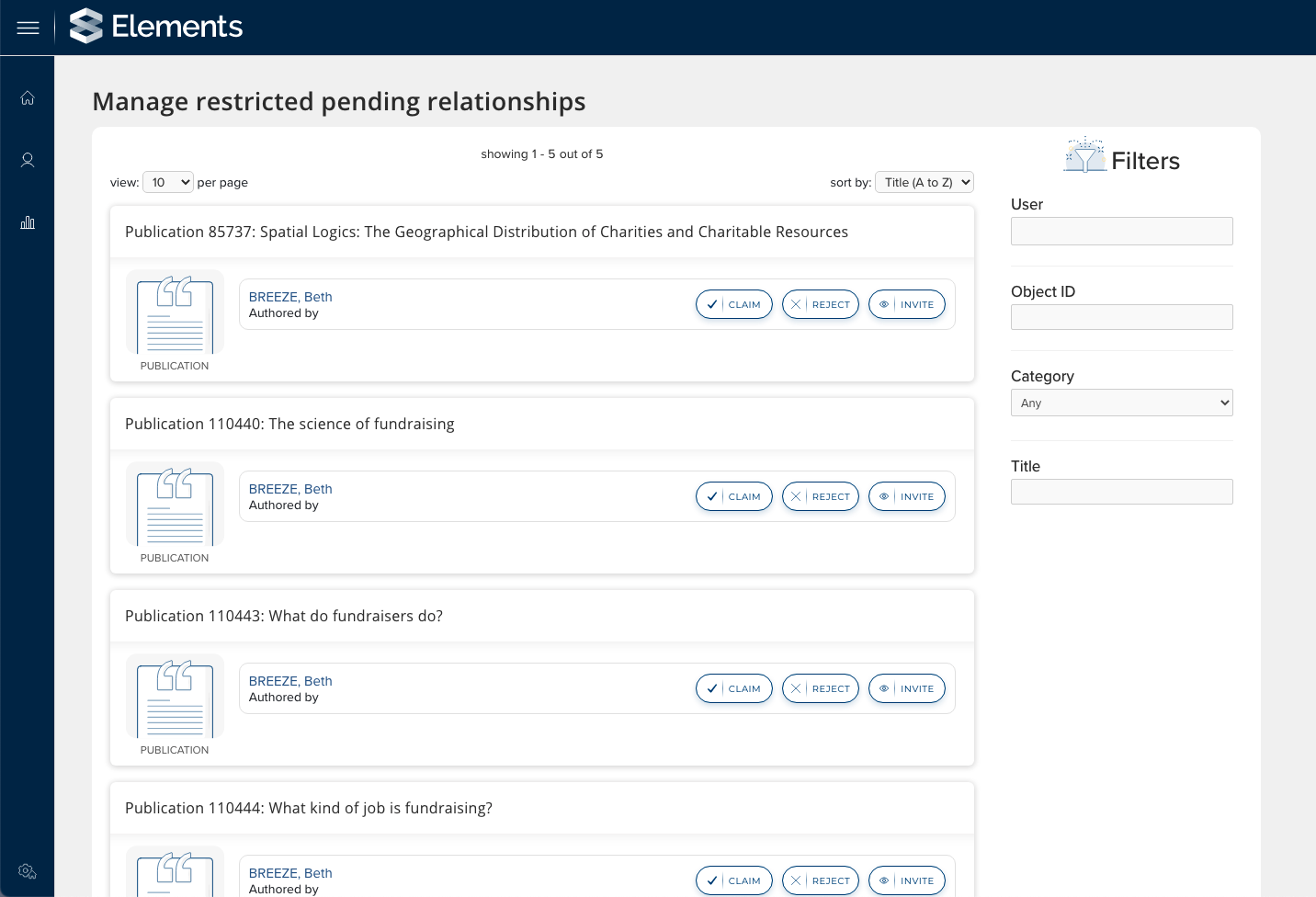 Pending (Restricted) Relationships page - This is a new page available to System Admins, System verifiers & Research information Administrators via the System Admin menu. It provides administrators with a list of all objects which have 1 or more Pending (Restricted) relationships. From here administrators with one of the above roles can link through to review the object, and can choose to claim or reject the relationship on behalf of the user or ‘invite’ the user to be able to view the item removing the ‘restriction’ from the pending link.