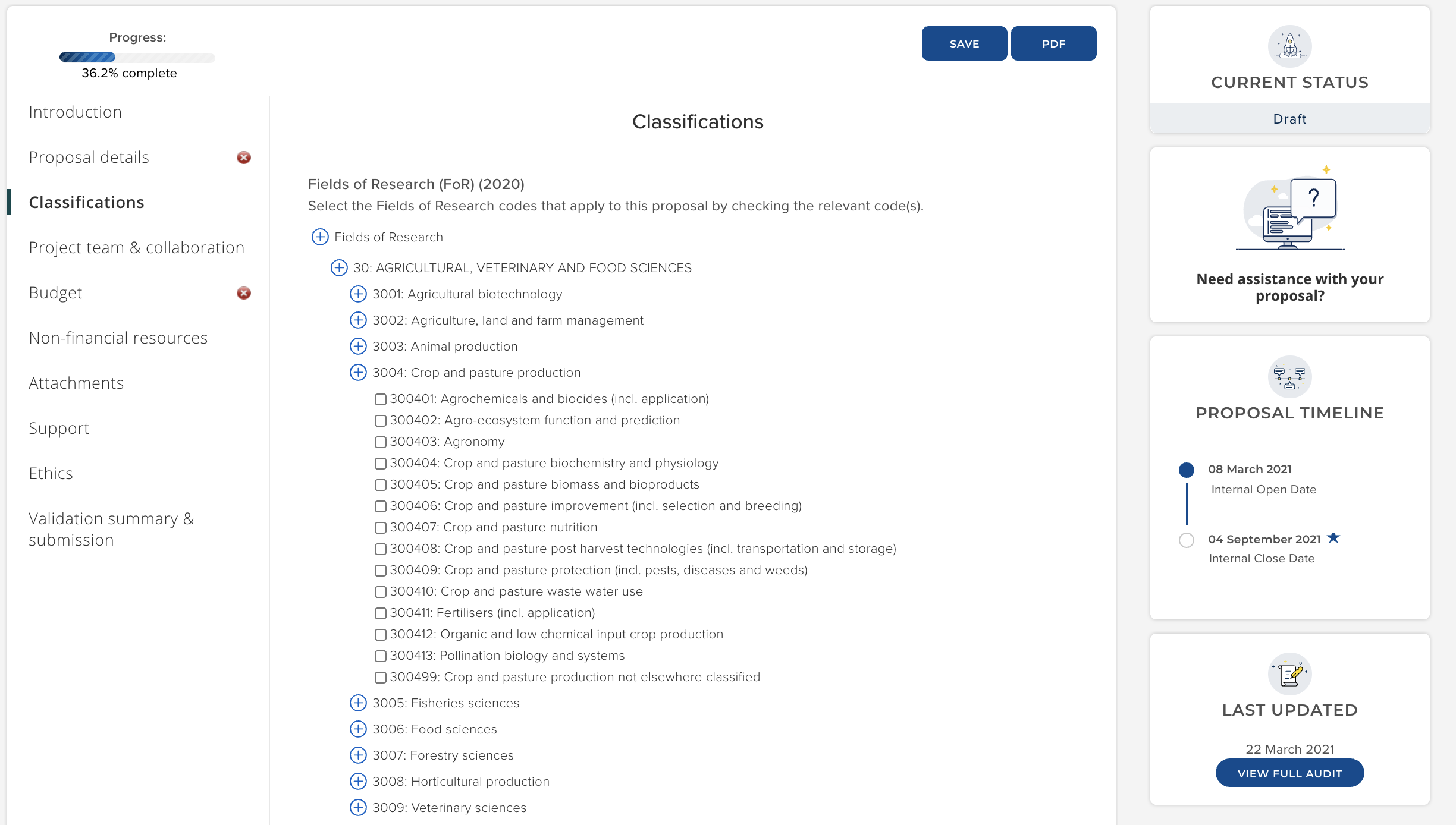 You can configure Proposal templates to ask researchers to select appropriate values from set classification schemes. For example, in the 'Basic proposal - V1' (stock template), researchers are invited to select the appropriate FoRs, ToAs, and SEOs.