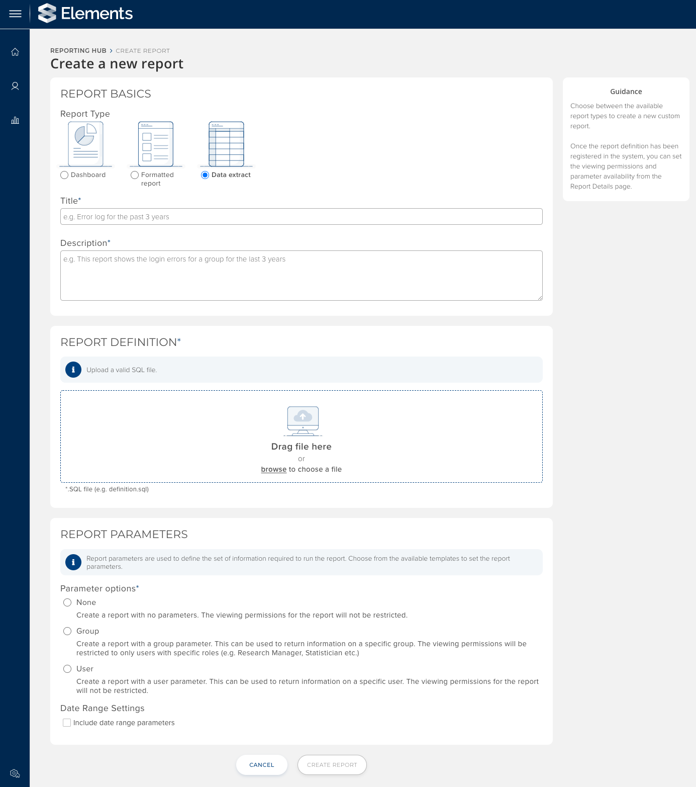 Image: An administrator adding a new custom data extract to the Reporting Hub by uploading an SQL query and configuring report parameters.