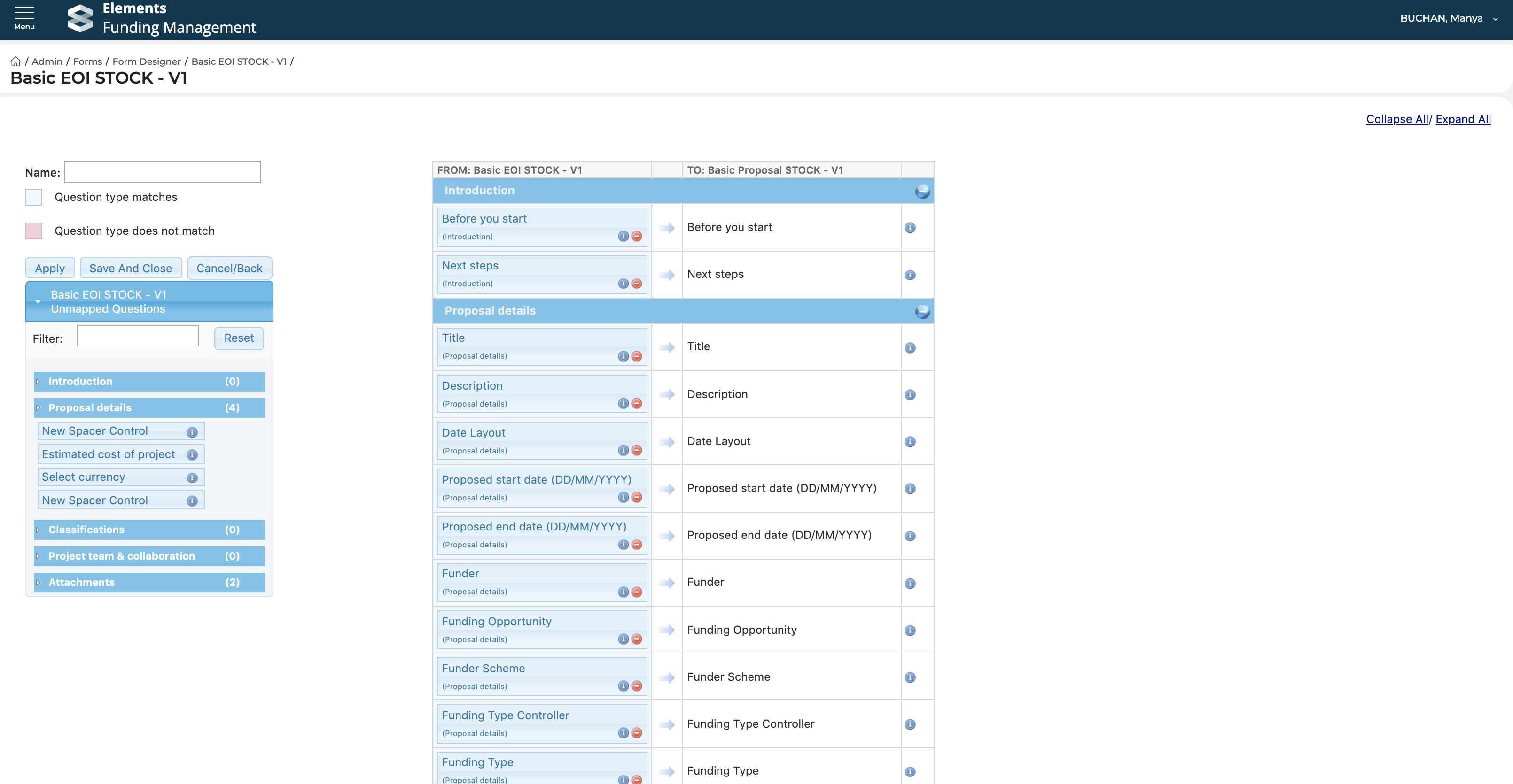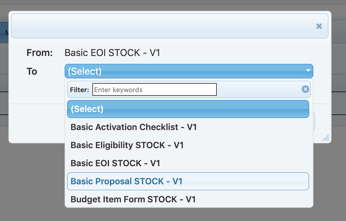 Where you have multi-stage funding opportunities and want to copy information input in a Proposal form from one stage to the next (saving researchers re-inputting data), you need to set up a mapping between the forms.