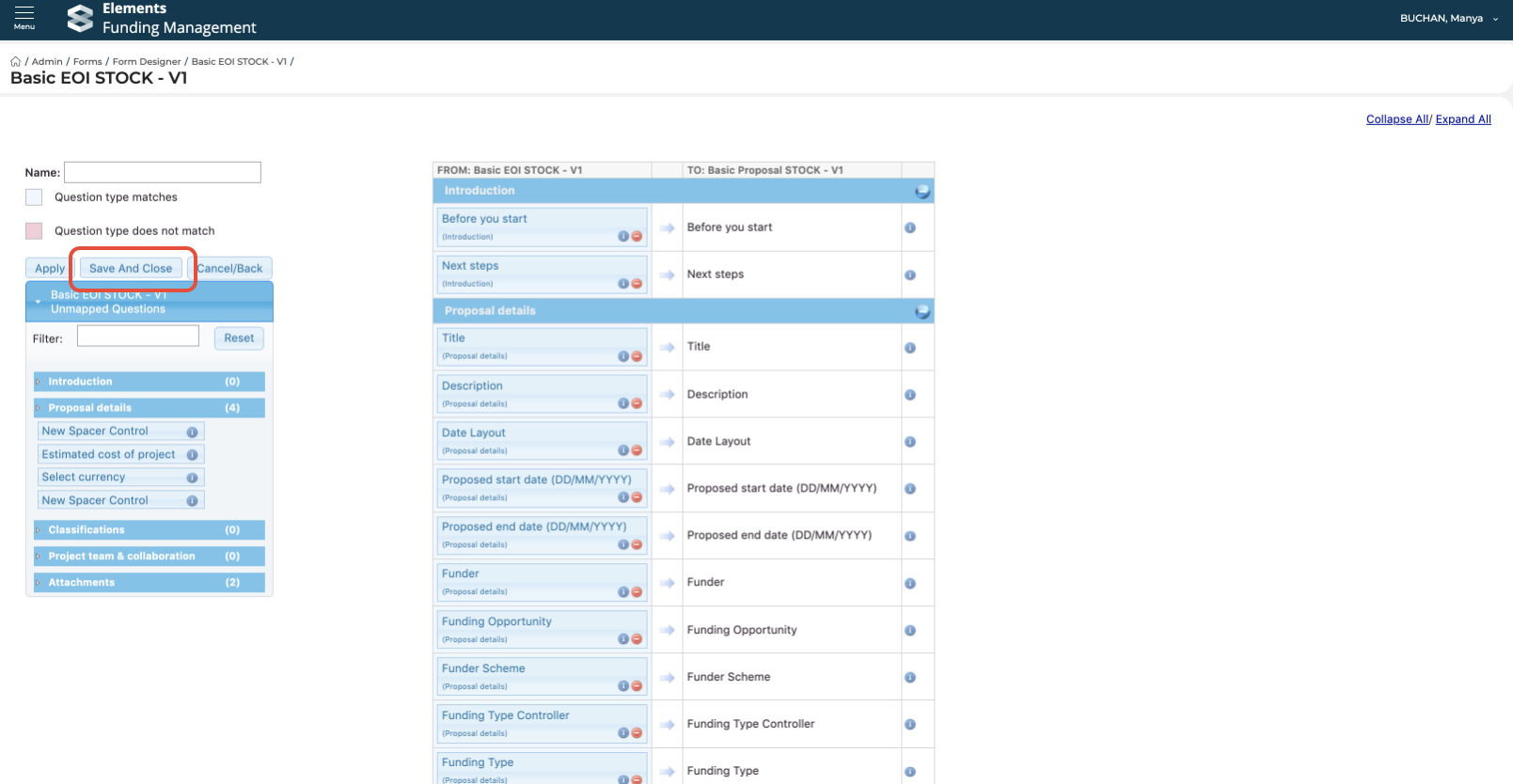 To map a control, simply drag it to where you would like to map it to on the target form template.When you have finished configuring your mapping, remember to give the mapping a name and 'Save and close' the mapping: