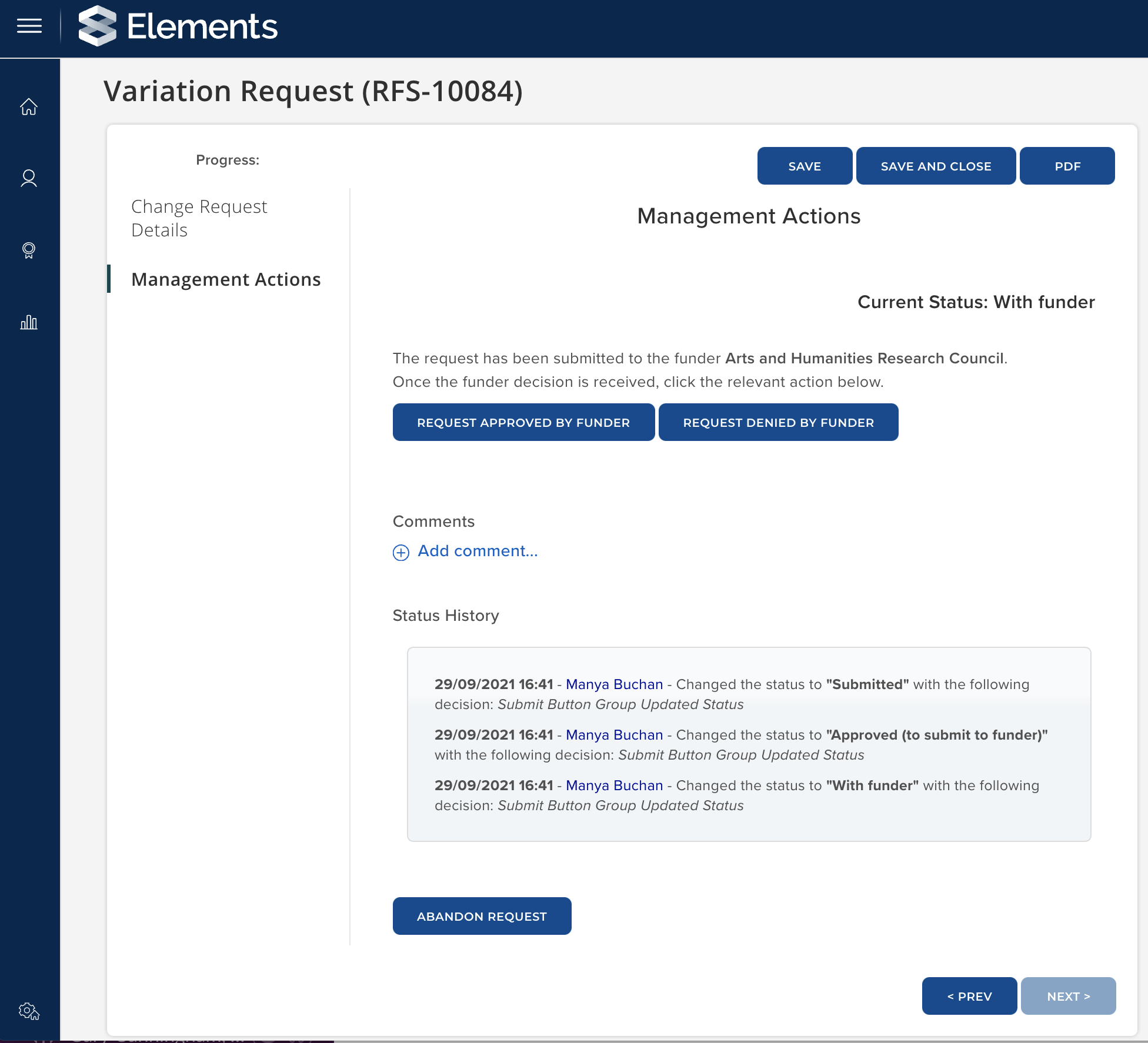 This release also includes the facility to manage change requests for active projects, enabling you to initiate a change request and capture relevant information (e.g. type, description, whether funder approval is required), progress the request through various states of approval, including funder approval, and action the request once / if approved.