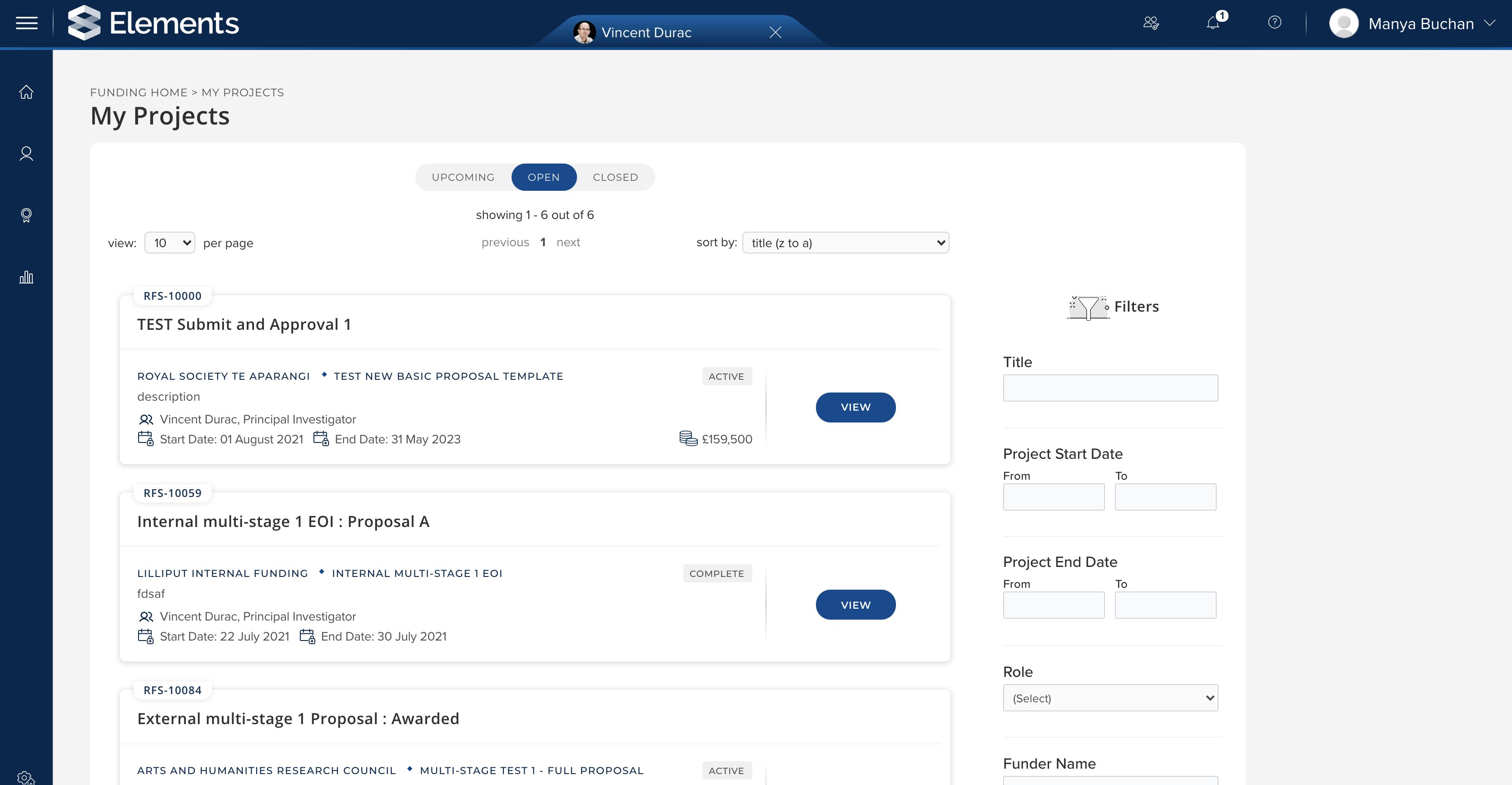 Upon Project activation, all named internal participants will be able to access the Project record from the 'My Projects' space, accessible from the Funding menu.