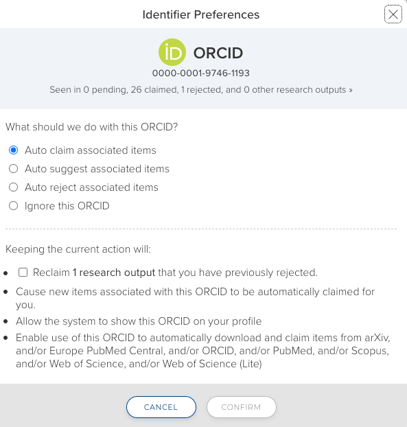 Autoclaiming - After completing a successful search of third-party data sources, Elements may suggest an ORCID that can be used for autoclaiming. As with other author identifiers, the ORCID iD can be configured to Auto claim associated items, Auto suggest associated items, Auto reject associated items, or to be ignored. The Elements synchronizer will search records from third-party data sources (Dimensions, Scopus, PubMed, EPMC and others) and, if requested, retrieve those items.