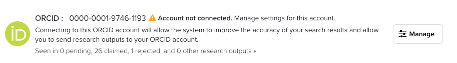 An author can also link their Elements account to ORCID by logging into their ORCID account. It the write integration is enabled, the ORCID Settings page can be reached either by going to Profile & Work > Personal profile & identifiers > ORCID settings, or if you already have a claimed ORCID iD, by clicking on the 'Manage settings for this account' link. If the write integration is not enabled then users can connect to ORCID by going to Profile & Work > Personal profile & identifiers > My research identifiers, or via the homepage action prompt if this is enabled.