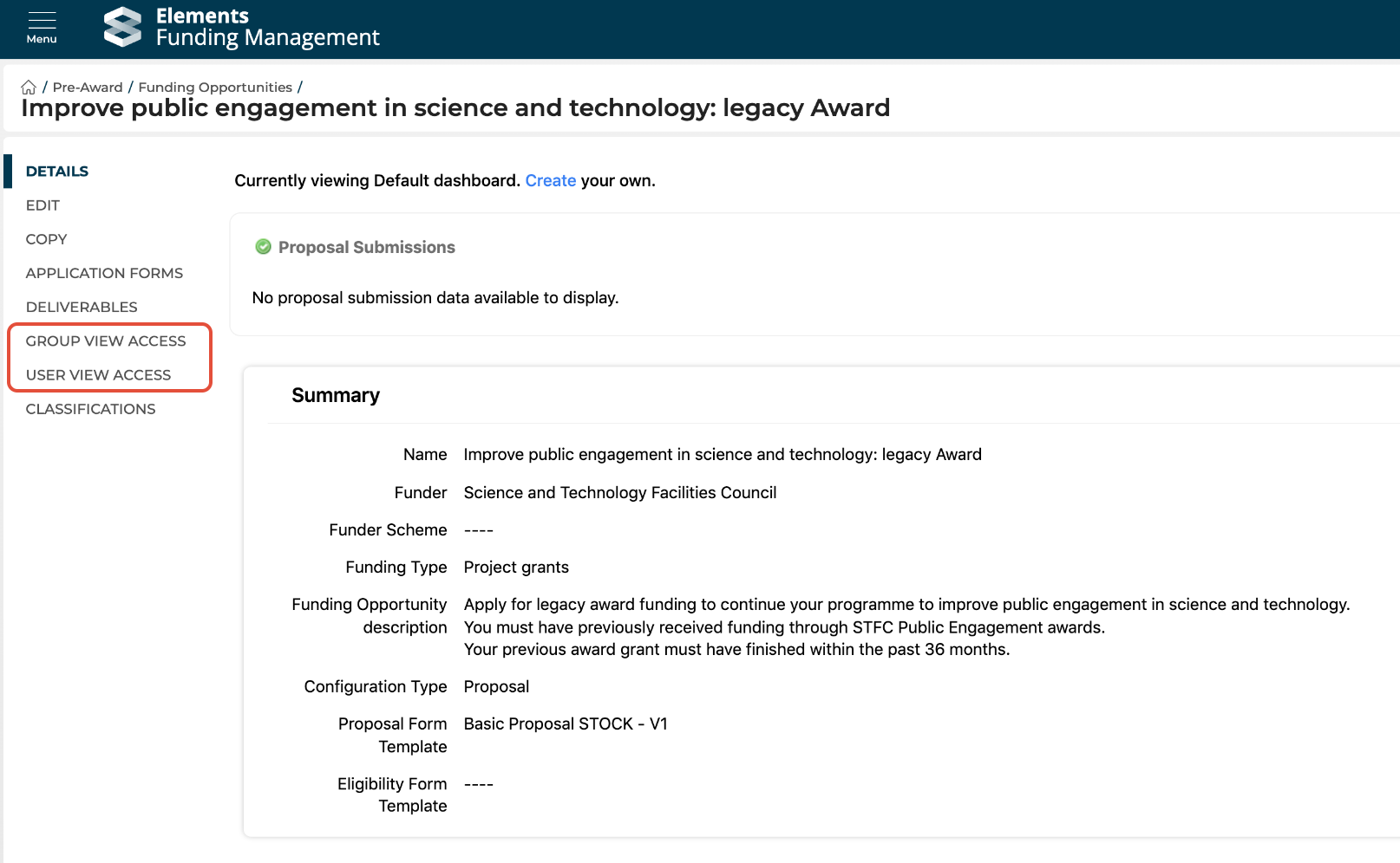 By default, when a Funding Opportunity is created, its access is set to 'Public' (meaning that any user with access to Awards Management will be able to see the Funding Opportunity and initiate a proposal). But it is possible to restrict the visibility of a Funding Opportunity to selected users and/or groups.