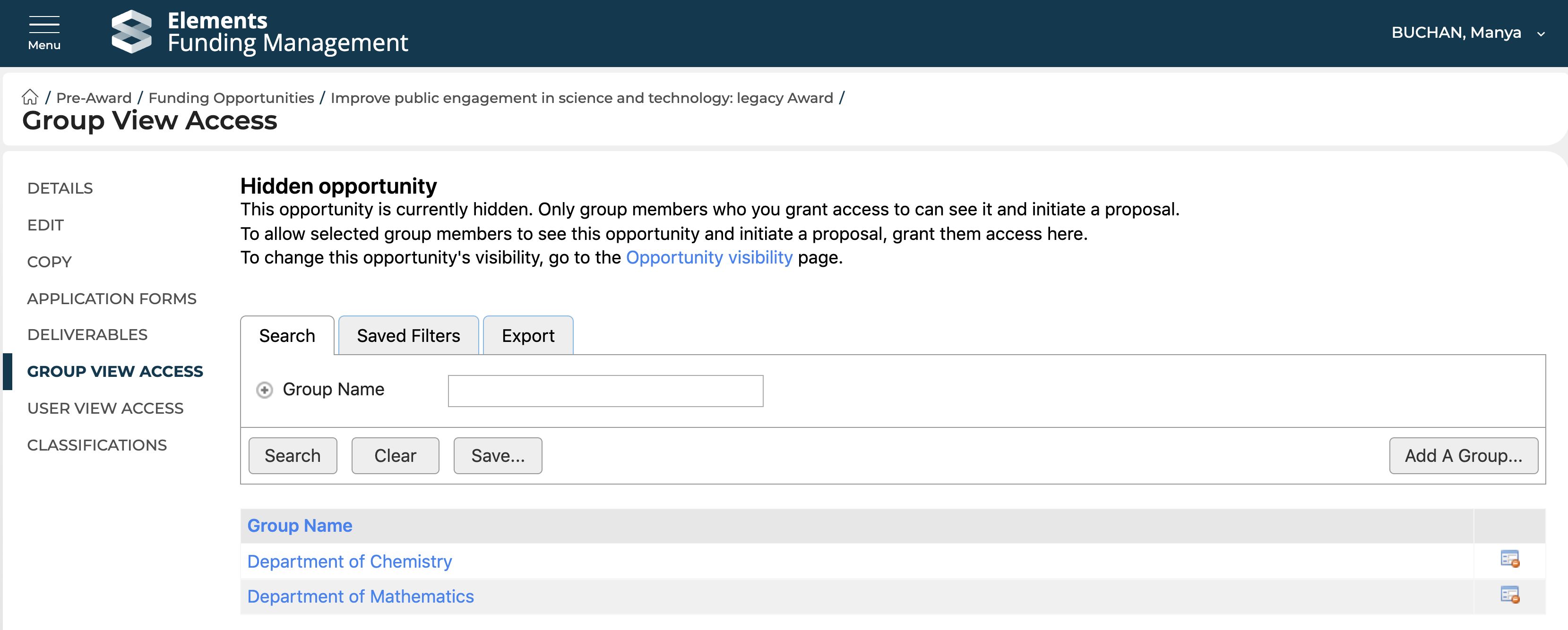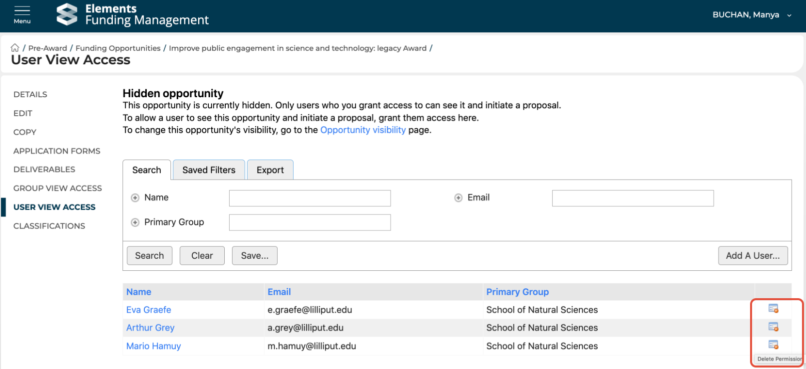 To remove an individual Group or User from having access to a Funding Opportunity, you can delete their permission from the Group / User view access screen.