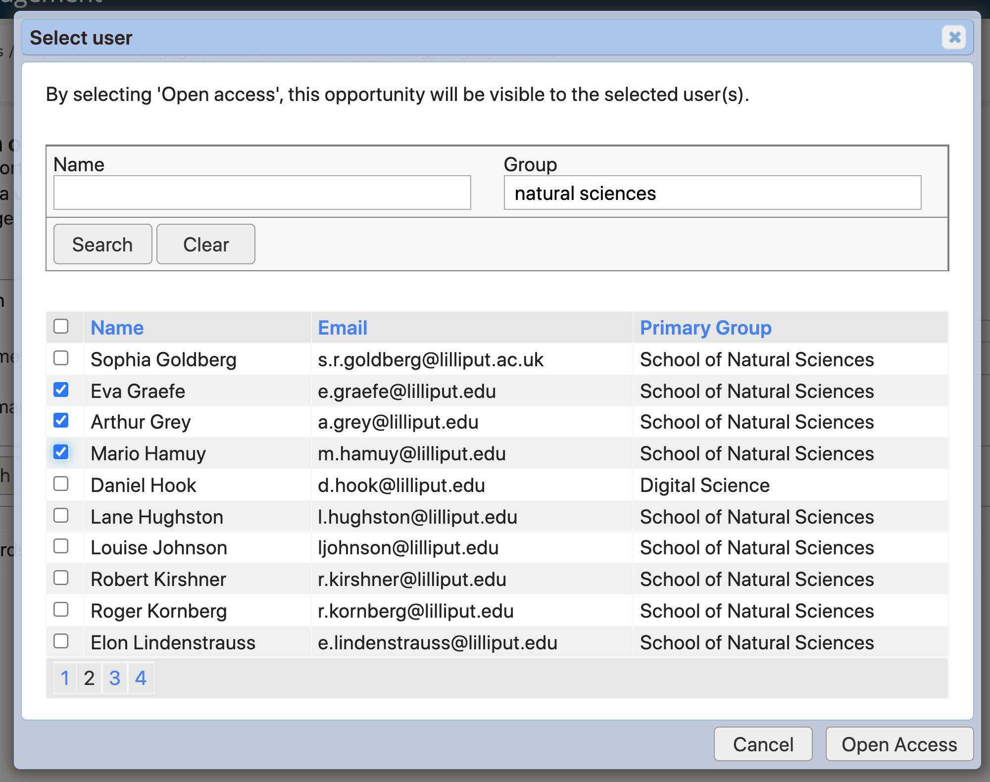Then search for and select the user(s) you would like to give access to (you can search by user name or by group membership). Then click 'Open access' to save your selection(s).