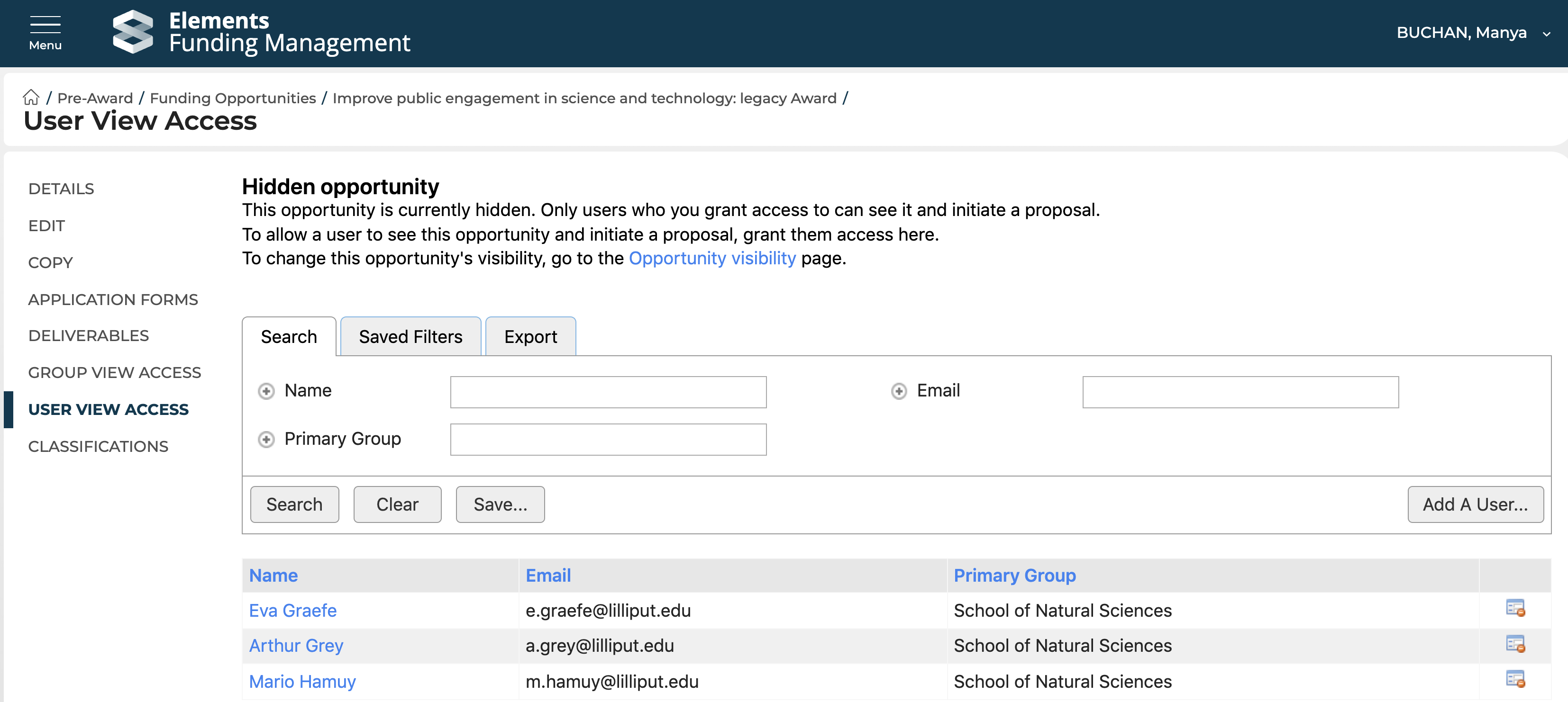 In the User view access page, select the user(s) you would like to give access to the Funding Opportunity by selecting 'Add a User'.