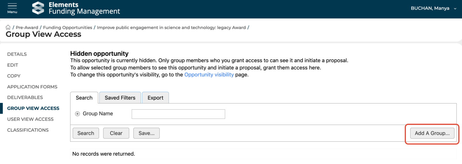 In the Group view access page, select the Group(s) you would like to give access to the Funding Opportunity by selecting 'Add a Group'. Making a Funding Opportunity visible to a Group makes that Opportunity visible to all members of that Group.