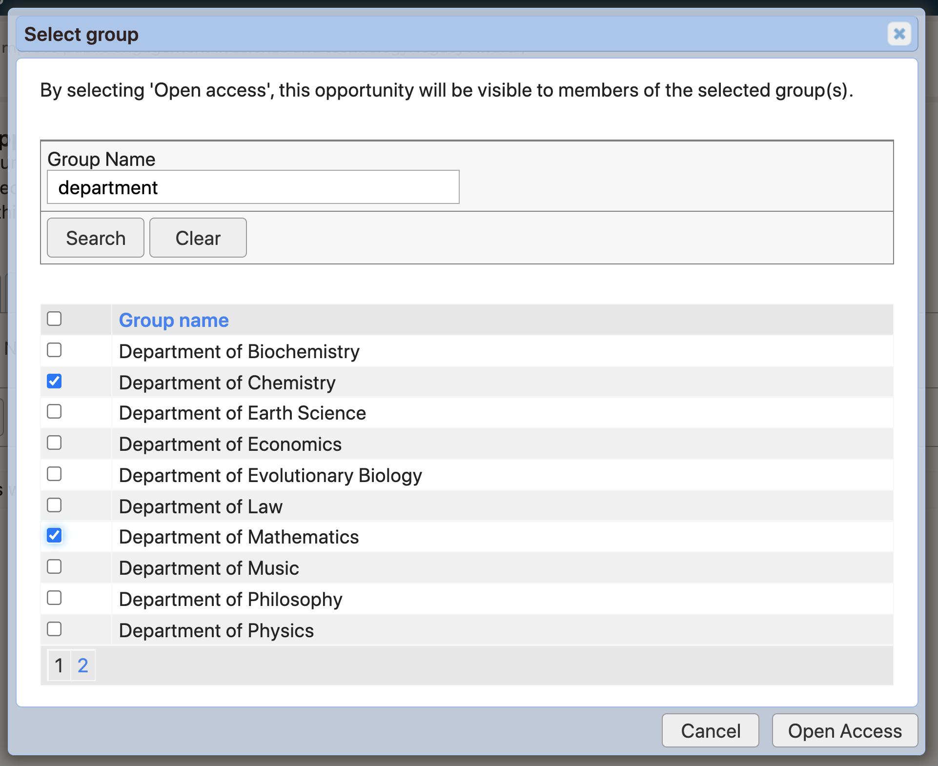 Then search for and select the Group(s) you would like to give access to, and then click 'Open access' to save your selection(s).