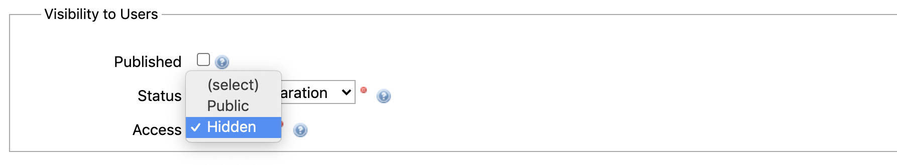 In the 'Visibility to users' section, select 'Hidden' in the Access field. This will hide the Funding Opportunity from all users.