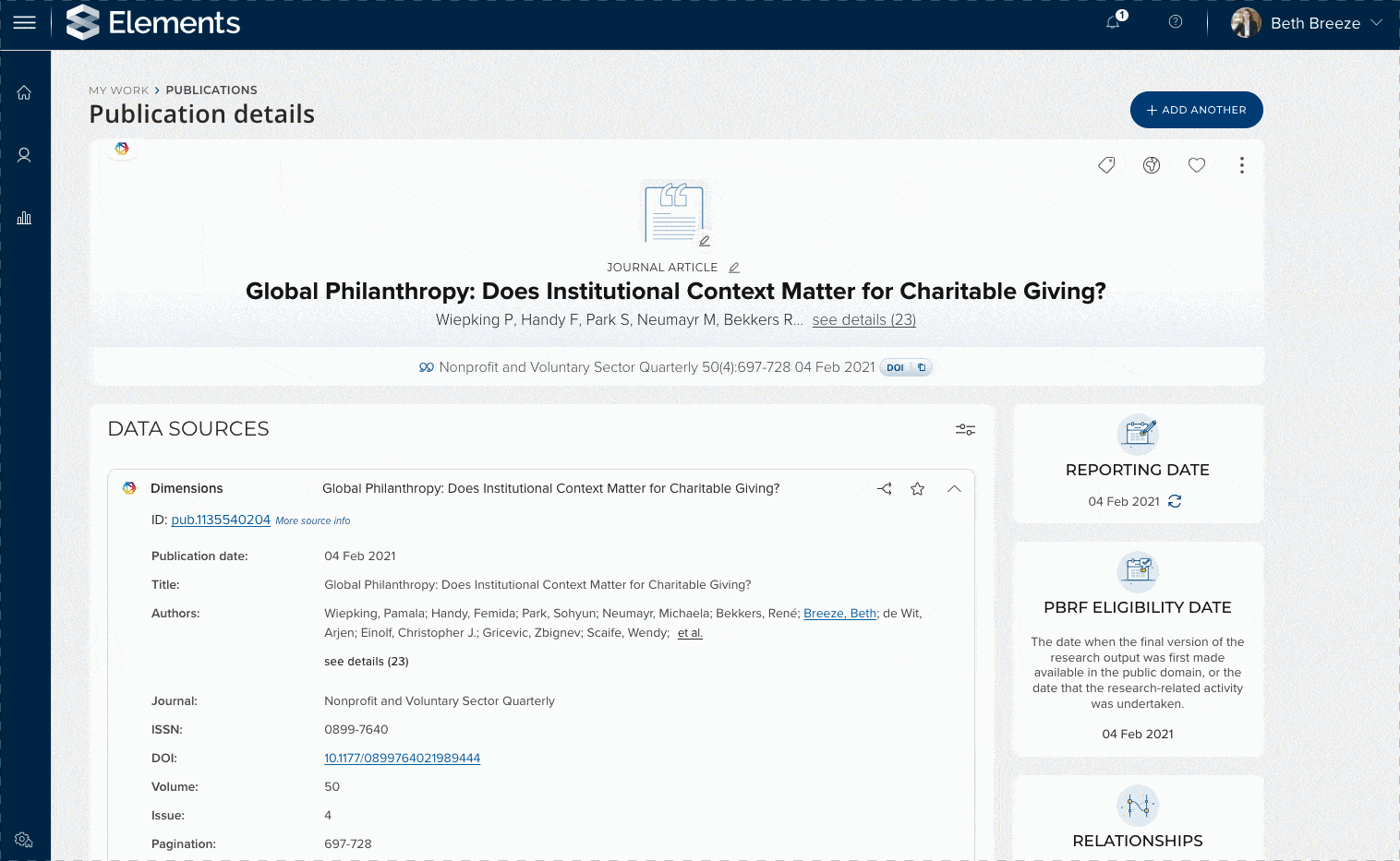 The Object details page (eg. Publication details, Grant details) is one of the most heavily used pages in Elements. It supports the curation and enrichment of the many works, activities and resources collected within Elements, and plays a key role in many workflows across the system, supporting open access deposits, annual reviews, internal reporting, national assessment exercises and more. It was time for us to give this hard-working page an update, so in this release we’ve done just that, redesigning the page to make UX enhancements, accessibility improvements and to introduce a number of new features as requested by our community.
