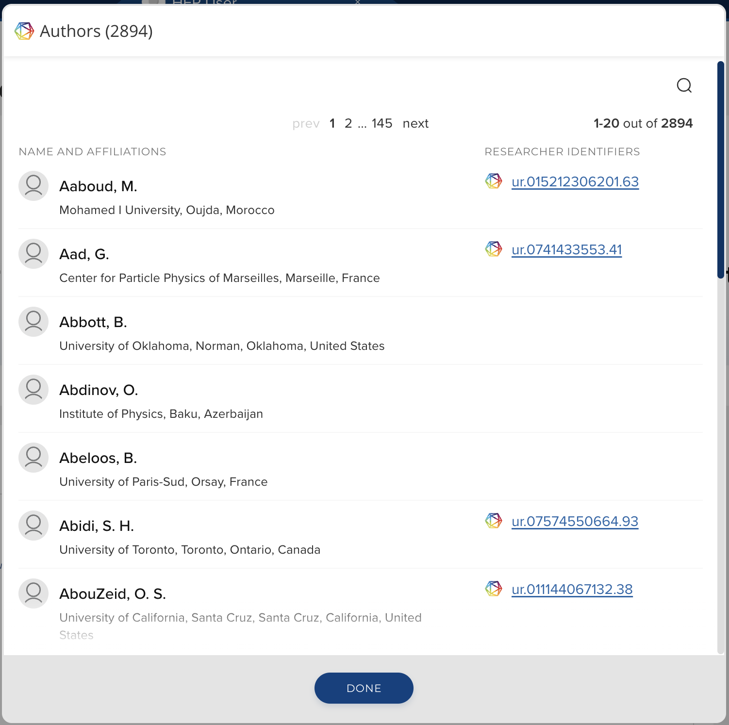 We have introduced a new searchable author details window to the Object details page which allows users to review information about the authors associated with a work including their names, affiliations and researcher identifiers. This new interface has been specifically designed to support works with very large numbers of authors and features a search function to help users quickly find the author they are looking for.
