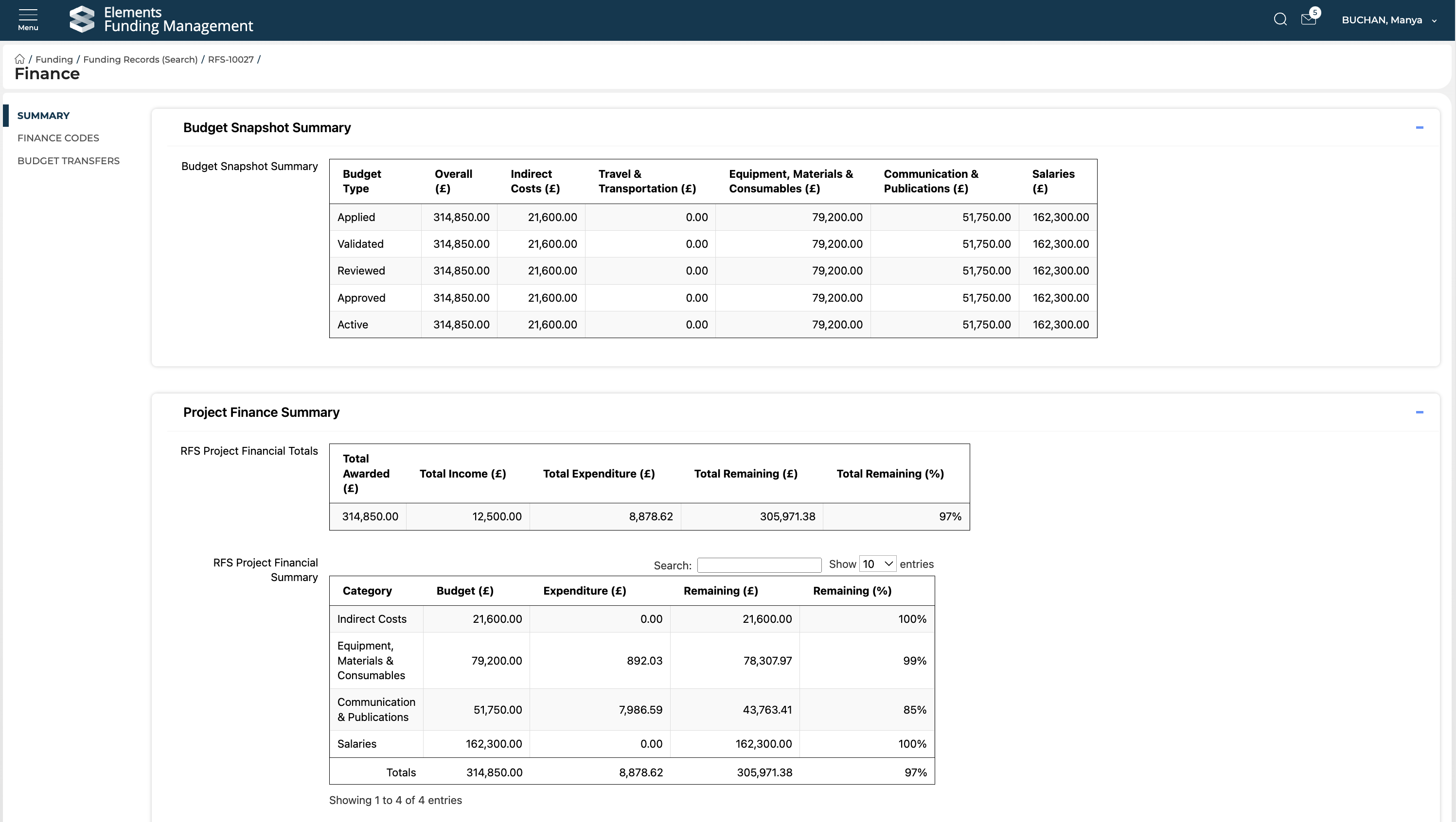 Imported income and expenditure information is visible on the Finance Summary screen for individual projects, and is available via the Funding Records endpoint in the API.